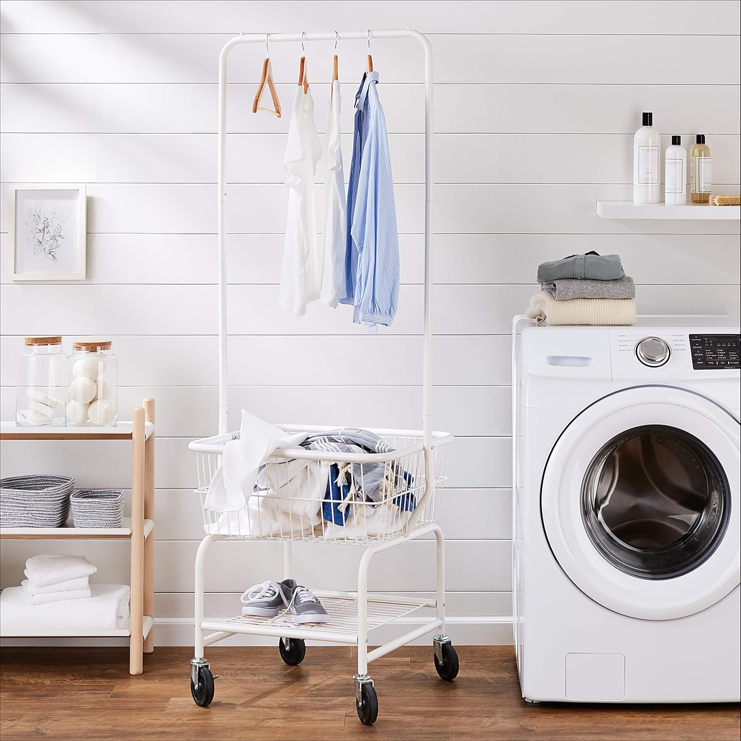 Amazon Basics Rectangular Laundry Hamper Basket Butler Cart with Wheels and Hanging Rack, White