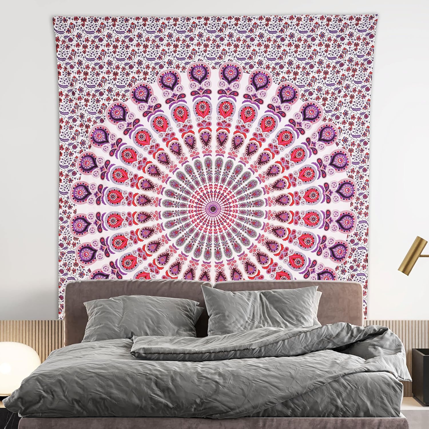 Bless International Handmade Indian hippie Bohemian Psychedelic Peacock Mandala Wall hanging College Dorm Beach Throws Table Cloth Bedding Tapestry (Pink Blue, King(88x104Inches)(225x265Cms))