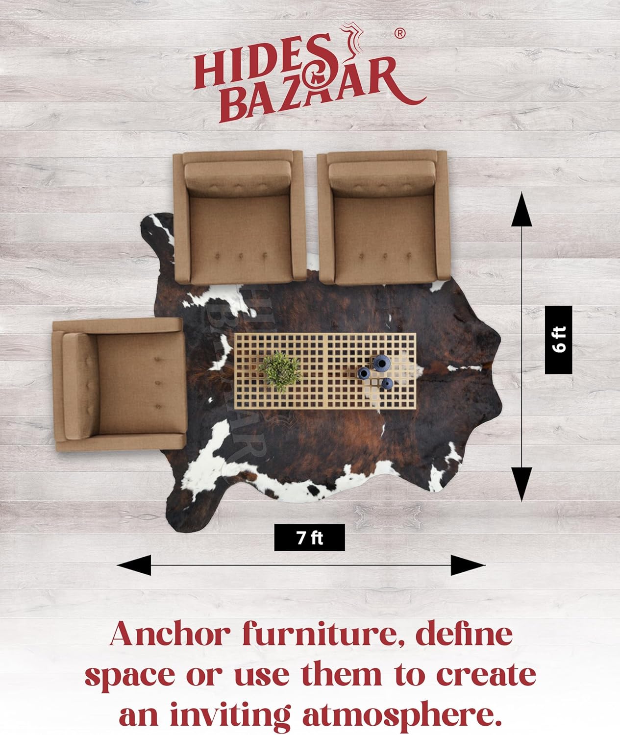 Natural Cowhide Rug for Home & Office Premium Dark Tricolor Cowhide Rug with Unique Dark Brown, Black & White Patterns- Cow Hide Rugs Made with Tanned Leather - Cow Hide Rugs 6x6-7 ft