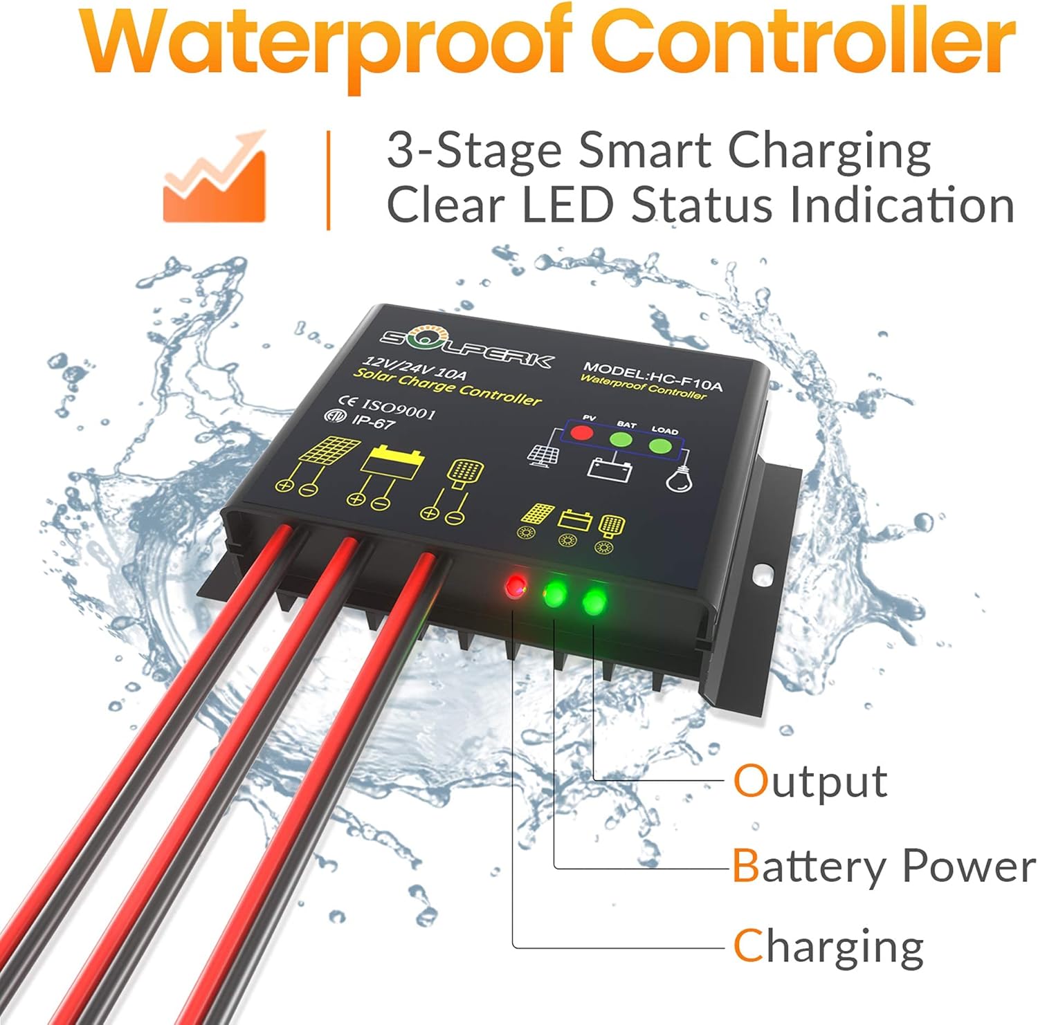 - 【Smart Charge Controller】IP65 waterproof charge controller. The charging efficiency of this upgraded 10A controller is 20%-30% higher than other controllers on the market. Its intelligent three-stage charging design effectively prevents the battery from overcharging. You will clearly know the charging status of the battery through the three indicator lights on the controller