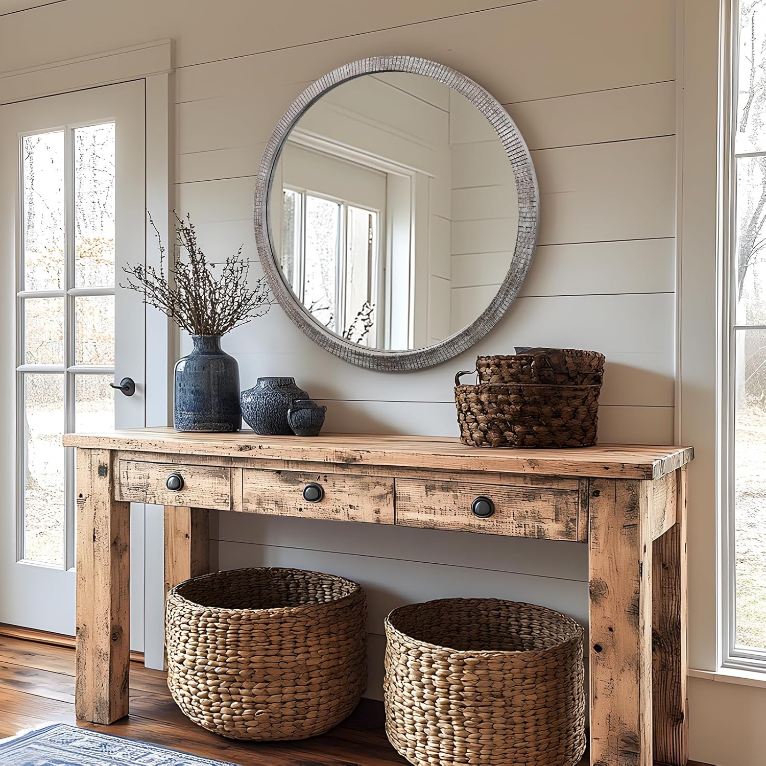 - NATURAL HOME DECOR: The element design of this round mirror 35 inches allows it to be integrated into any place and can add retro style to your home decoration. It can be used as a living room mirror, bedroom mirror, entryway mirror, or farmhouse wall decor. Provide a simple visual appeal to your room and be the perfect focal point for the entire room.