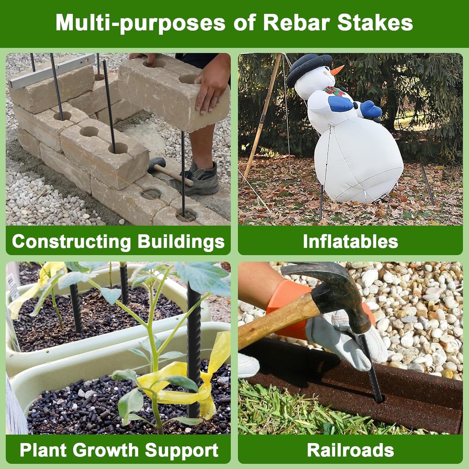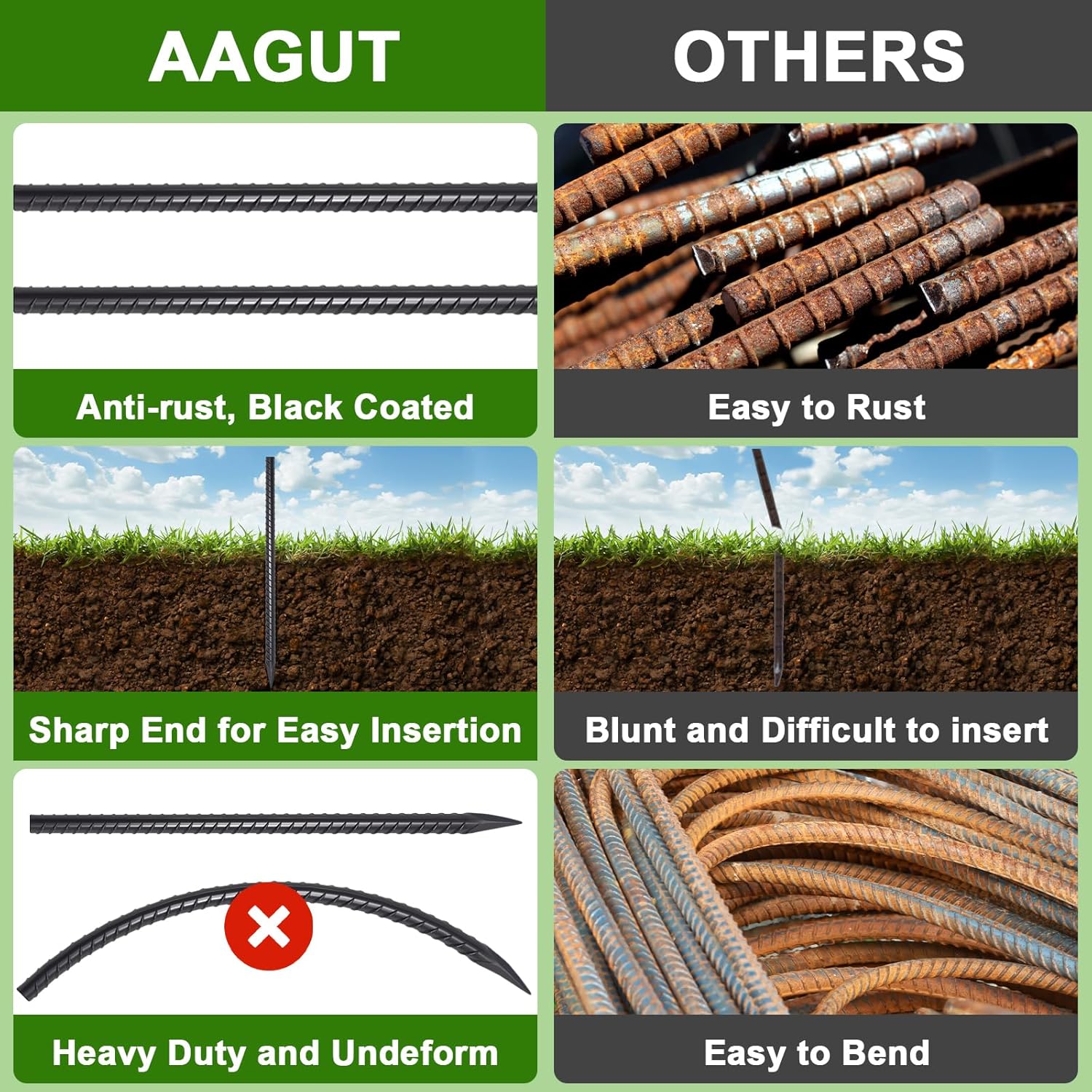 - Heavy Duty Rebar Spikes: Ground stakes are made of high quality malleable steel and applied black powder coated, withstanding harsh weather, resist broken for long lasting performance and all types ground even in wet soils for years