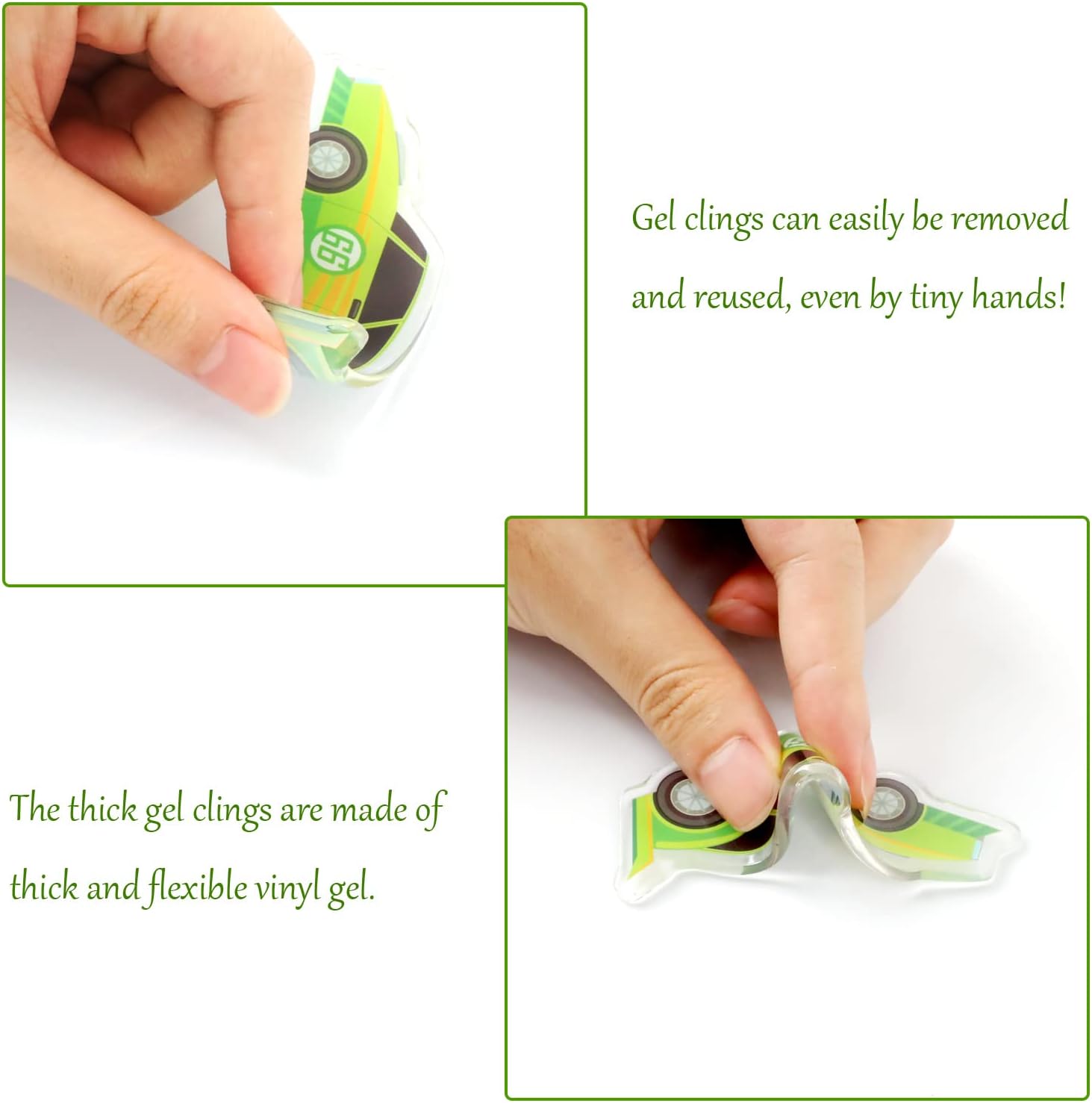 - Note:Racing car thick gel clings are not edible. These thick gel window clings are suitable for children 5 years and older to play, and there is a risk of suffocation. They need to be accompanied by an adult when playing.
