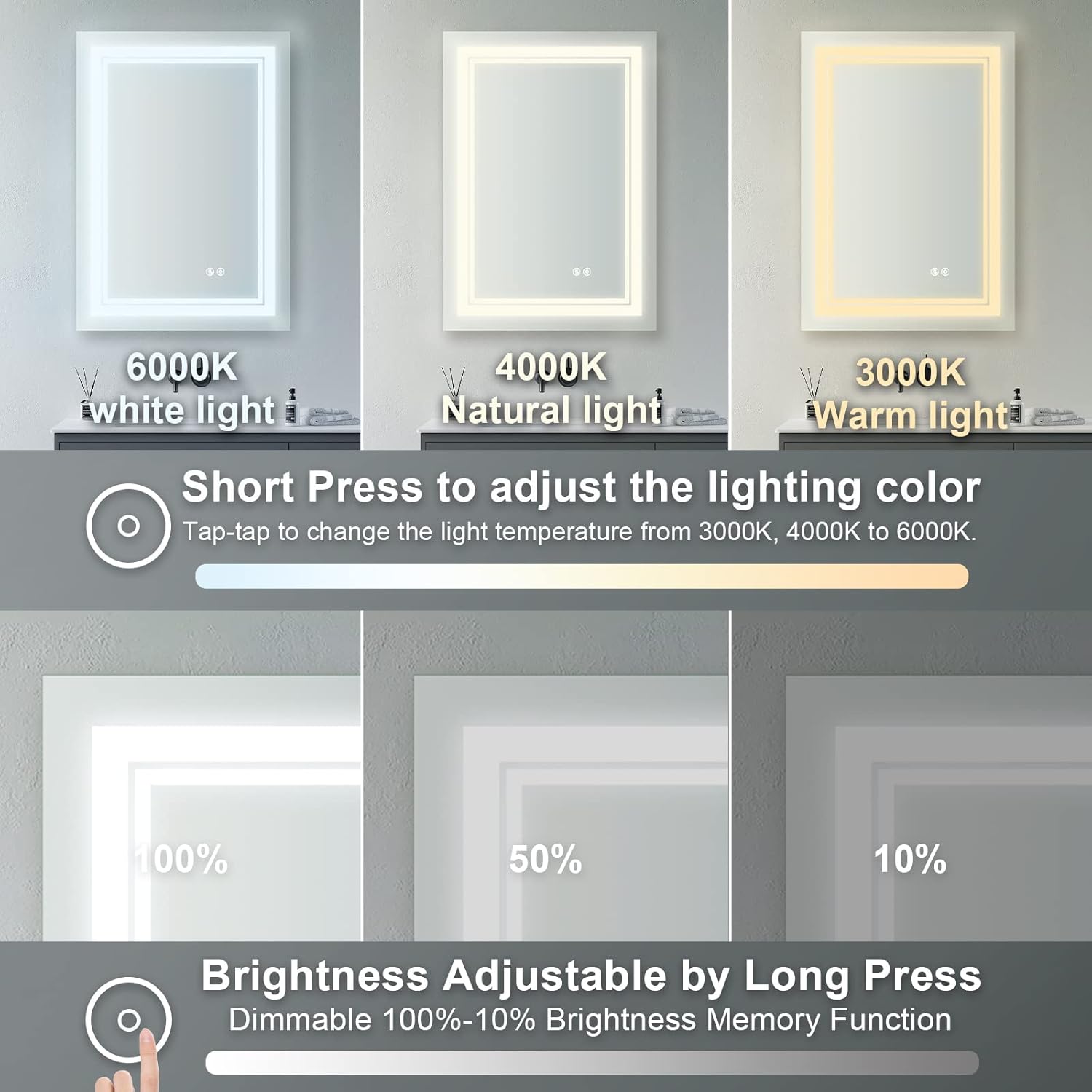 - Dimmable: Our smart vanity mirrors can adjust the color (warm, natural and white) and brightness (100%-10%) of the lights. Not only that, the lighted bathroom mirror also has a memory function. The next time you turn it on, it will keep the light color and brightness that suits you best. Perfect for hotels, high-end salons or bedrooms and bathrooms at home.