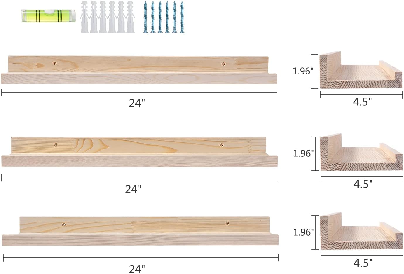 - Wall Mounted Floating Shelves Size: 24 inch x 4.5 inch x 1.8 inch (L x W x H), a set of 3 natural wooden floating shelves. Wall ledge shelves are sturdy enough to hold your favorite collections, family photos, kidsβ books, decorative items, cosmetics or green plants.