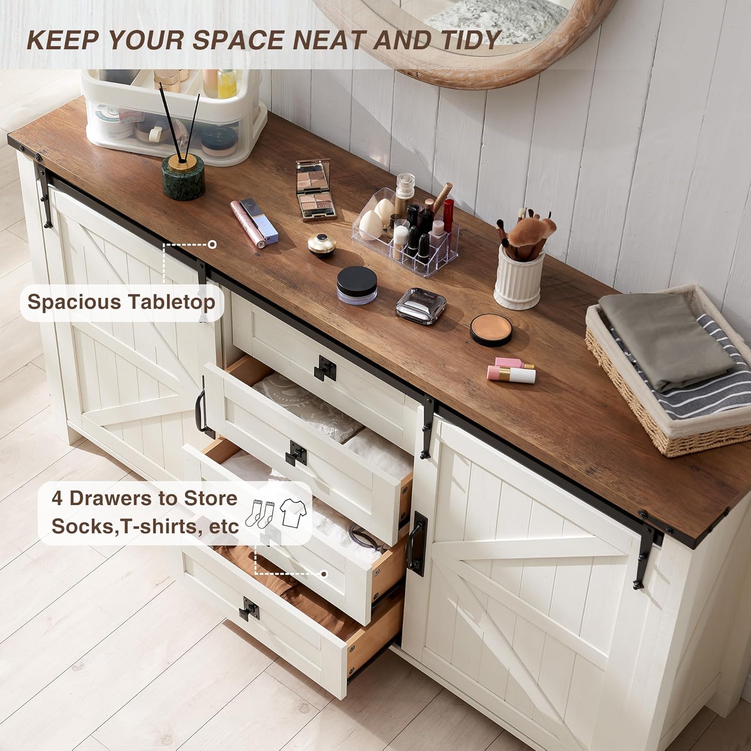 - MULTIFUNCTION STORAGE ORGANIZER: This sliding barn door dresser is ideal for wherever to save you from clutter and keep your space neat and tidy, such as the bedroom, nursery, closet, entryway, dorm, living room, or kitchen; and matches perfectly with other T4TREAM dressers.