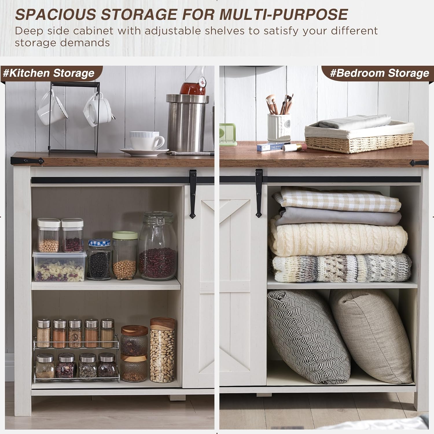 - SLIDING BARN DOORS: The farmhouse space-saving barn door slides open on a metal track to reveal adjustable shelf space, allowing you to freely hide or show storage spaces. The shelf with 3 height adjustable and is also removable enabling flexible storage of different-sized items. The smooth-glide track makes it convenient for people of all ages and abilities to open and close with minimal effort. The dresser with sliding barn doors can be particularly beneficial to maintain a clutter-free and organized look.