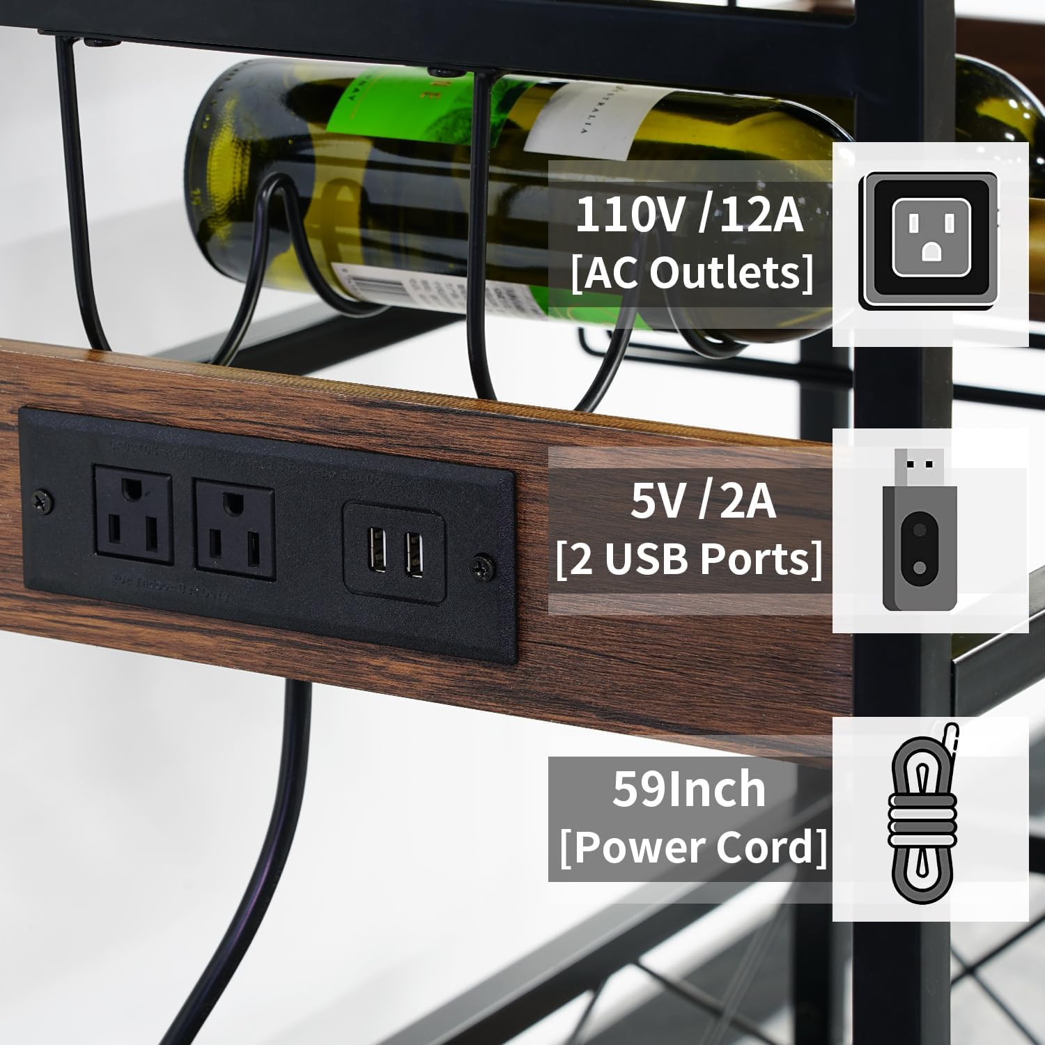 - Power Outlets: The industrial bar cart features power outlet of 110V/12A outlet and 5V/2A USB interface offering safe charging; the serving cart has a 59 inches electric cord, no need to move your coffee makers, toaster or microwave to get charged;