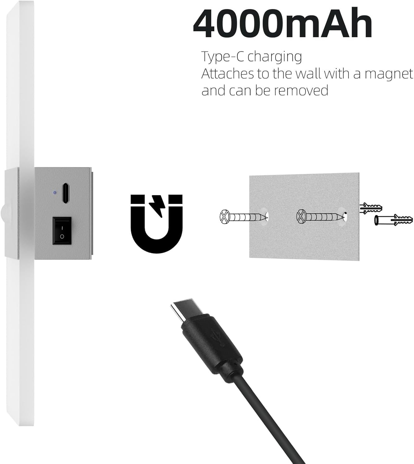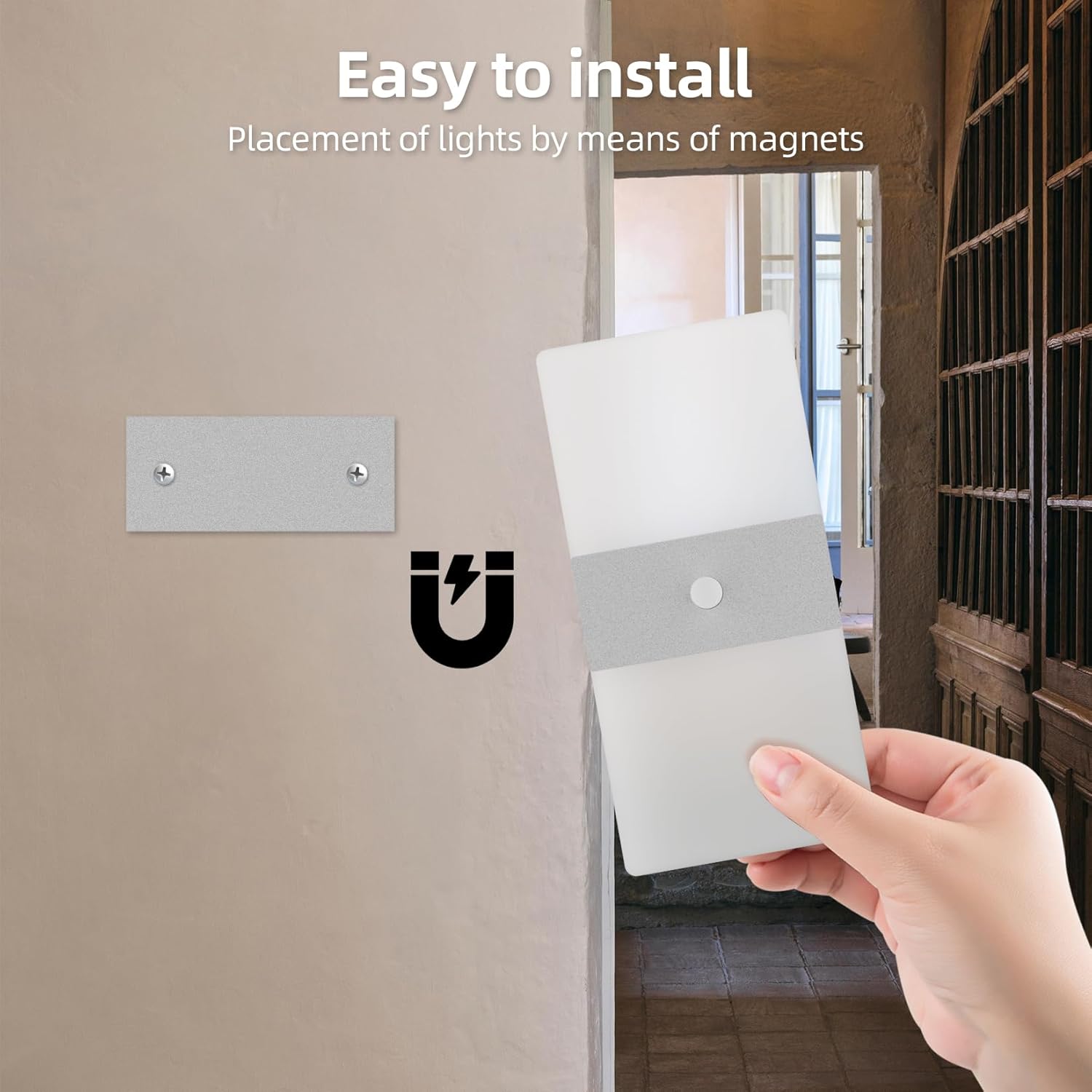 - 💡【Easy Installation】1.Use the included screws to secure the iron piece of the base to the wall.2.Magnetic adsorption, the battery wall light lamp body can be easily adsorbed to the base by the built-in magnet, so it can be effortlessly mounted on any iron surface.