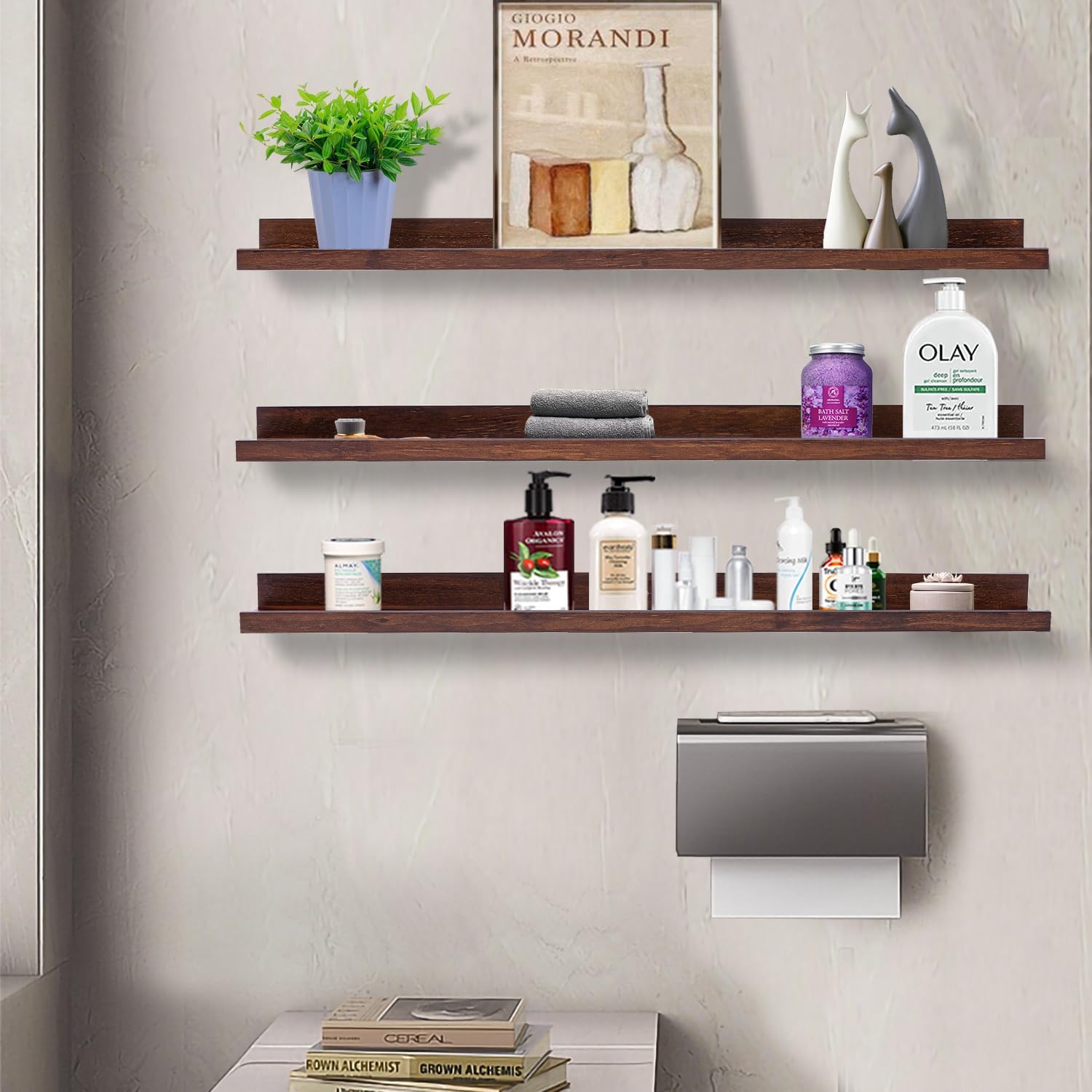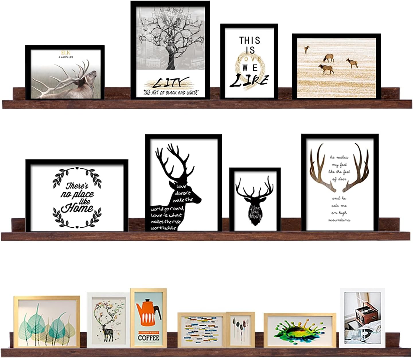 - [Ideal for Wall Decor]: The size of photo ledge is 48 in x 4.5 in x 1.8 in, a set of 3. This wall floating shelf makes greater use of your wall space and adds a decorative touch to your home. This wall floating shelf in deep walnut wood color is suitable for various styles of furniture decoration, simple and generous.