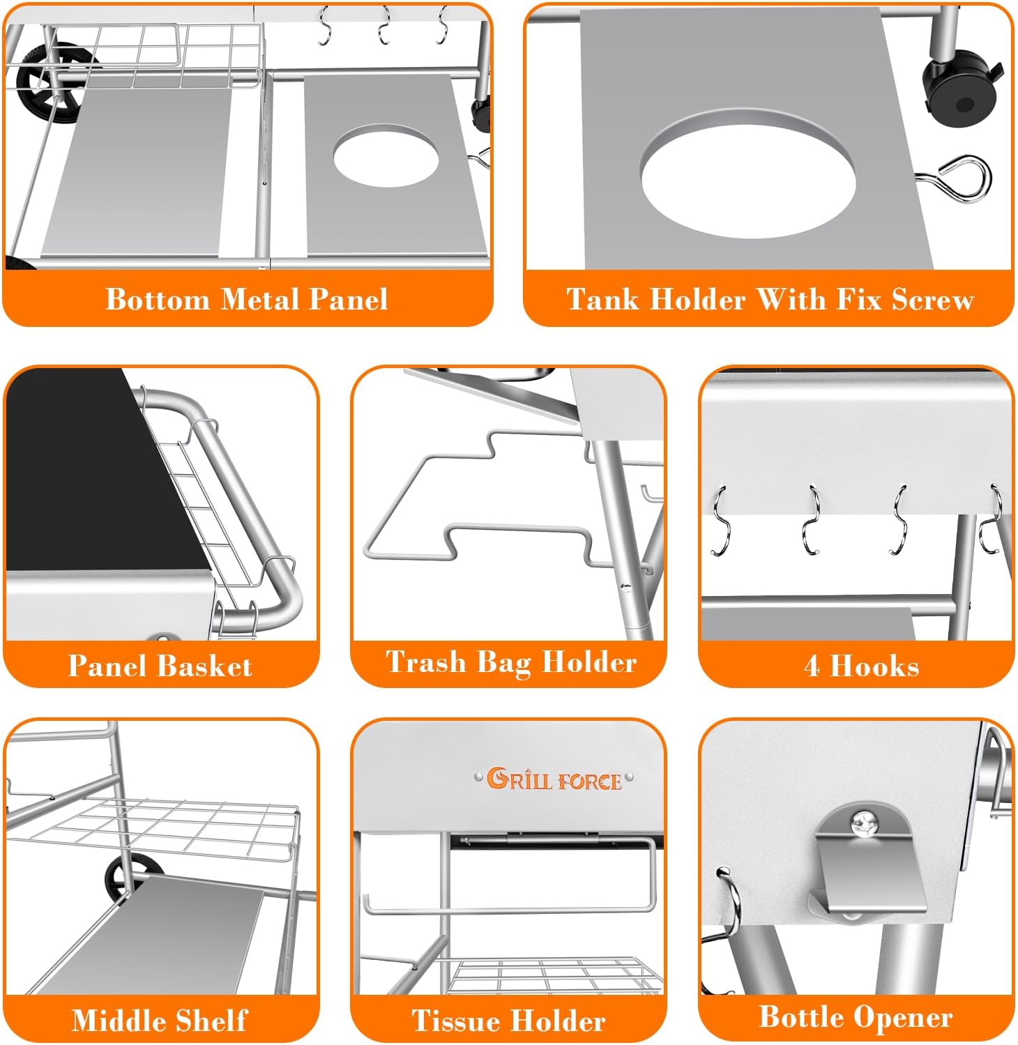 - 【Spacious Work Area with Ample Storage】The expansive tabletop offers a generous area for preparing ingredients and cooking. The middle shelf can hold plates and utensils, while the bottom shelf is perfect for storing seasoning bottles, sauces, and the propane tank. This three-tiered structure ensures you have all your essentials organized and within reach.