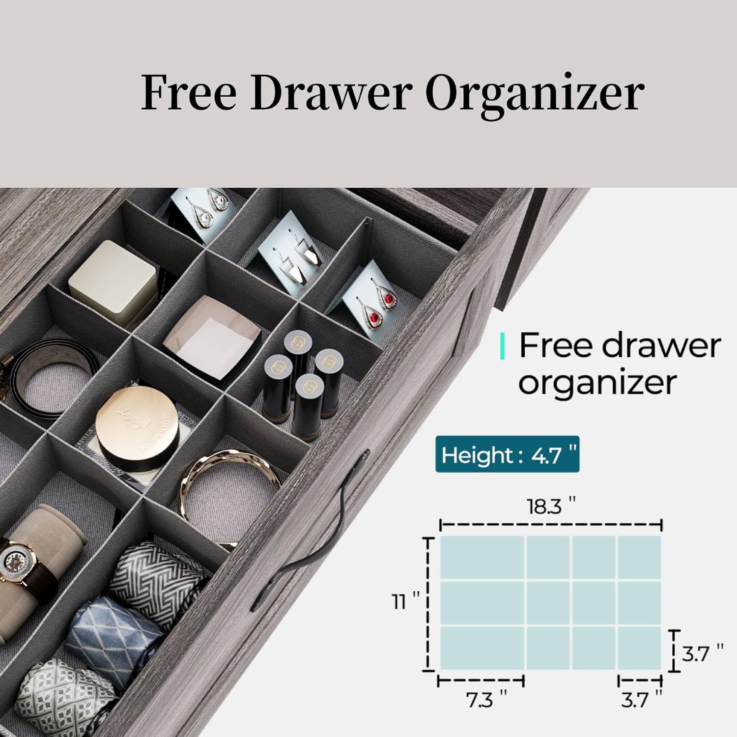 - Eco-Friendly Wood Construction: Fashioned with eco-friendly manufactured wood, this grey dresser for the bedroom boasts a clean and sleek design. Its waterproof seal ensures durability and safety, making it a reliable dresser organizer for any space.