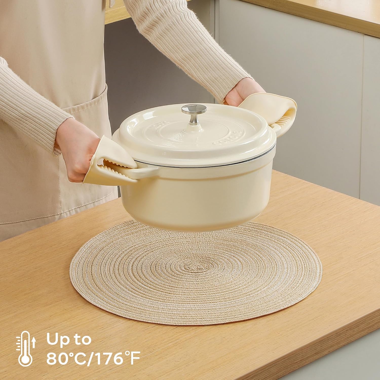 - Protect Your Dining Table: Our placemats can withstand temperatures up to 176°F (80°C), protecting your table from stains, hot food, or scratches from tableware. With a diameter of 15 inches, they perfectly fit a variety of tableware