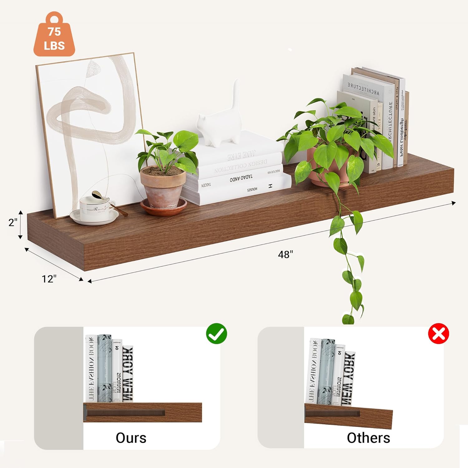 - Deep Floating Shelves- Sized in 48"L x 12"D x 2" H. These extra deeper and thicker wall shelves are 12 inches in depth and 2 inches in thickness instead of the regular narrow floating shelves, wall floating shelves are fixed with solid dual-pipe iron stands and a stable wall shelf It is an ideal place to display your beloved photos, trophies, and other delicate decorations. The bracket has been upgraded from 6.5in to 8in, which greatly solves the problem that the product will sag when installed.