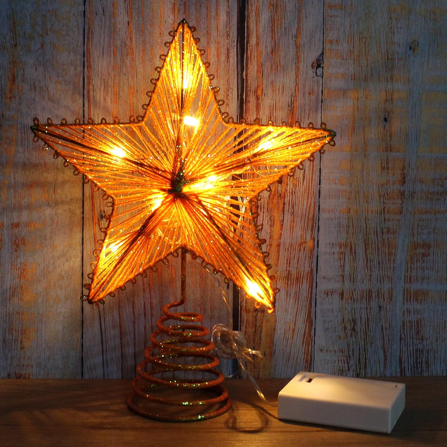 CVHOMEDECO. Champagne Glittered 3D Tree Top Star with Warm White LED Lights and Timer for Christmas Tree Topper Decoration and Holiday Seasonal Décor, 8 x 10 Inch
