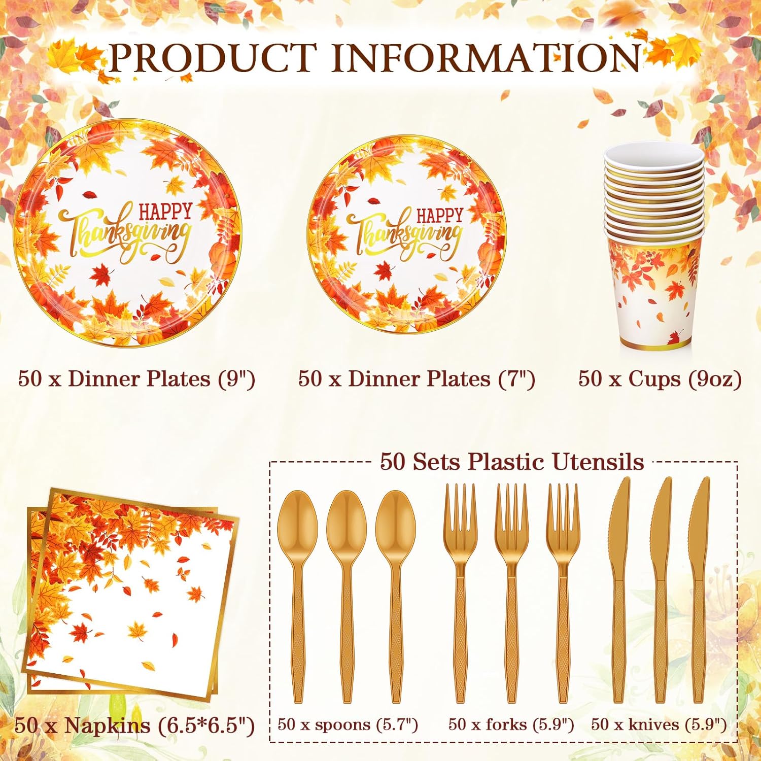- Elegant Party Package For 50: the exquisite fall party tableware set includes 50 pieces of 9-inch dinner paper plates, 50 pieces of 7-inch dessert paper plates, 50 pieces of napkins, 50 pieces of 9 oz paper cups, and 50 plastic cutlery sets; All ripe in attractive leaf style designs; Ensure your party has the concept of sophistication without compromising on quantity