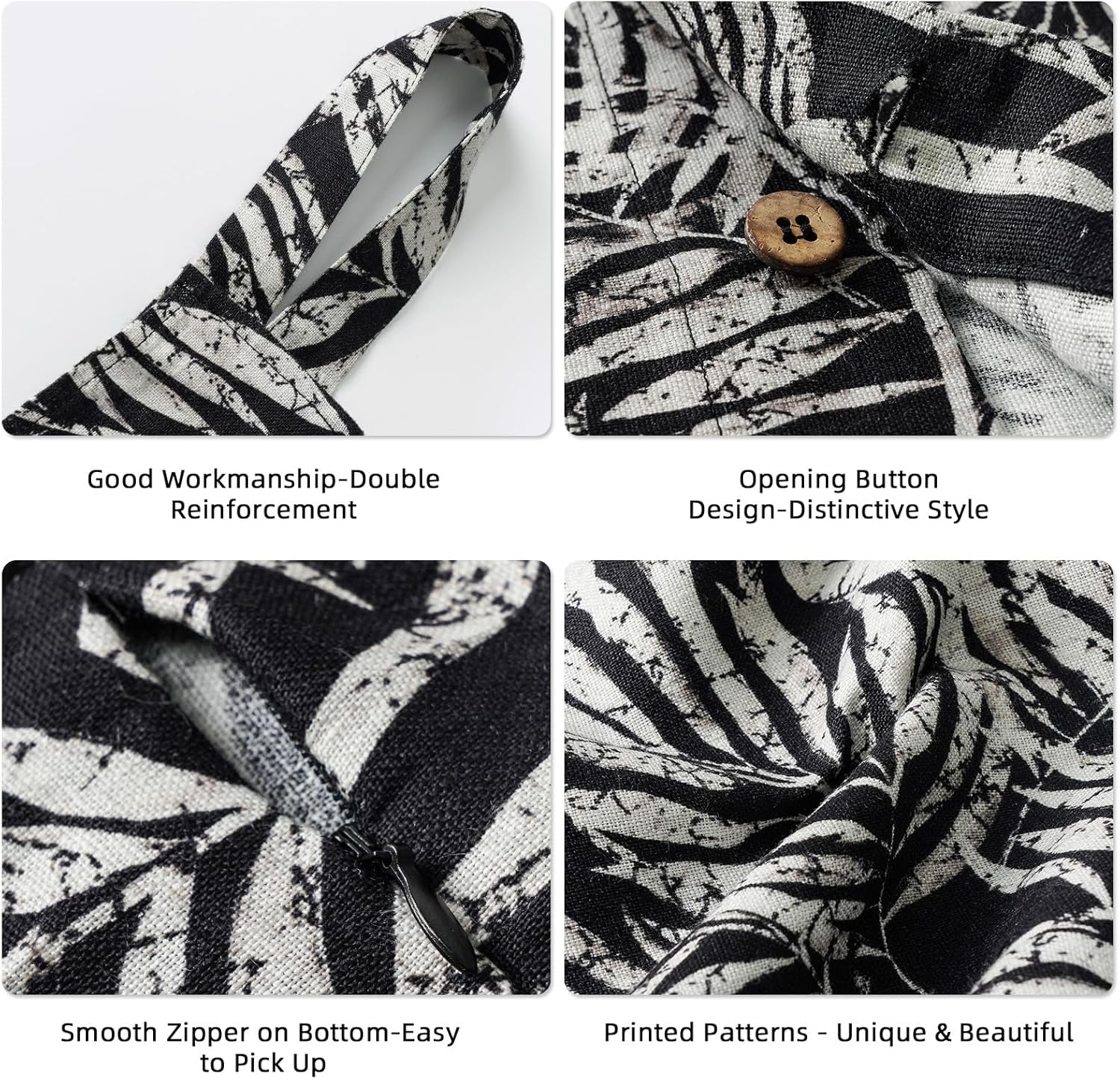 Linen Hanging Laundry Bag, 100% Linen Leaf Print Over The Door Laundry Hamper with Buttons and Zipper, Space Saving Door Hampers for Laundry Dirty Clothes Home Travel, Black, 19.7x27.5inches