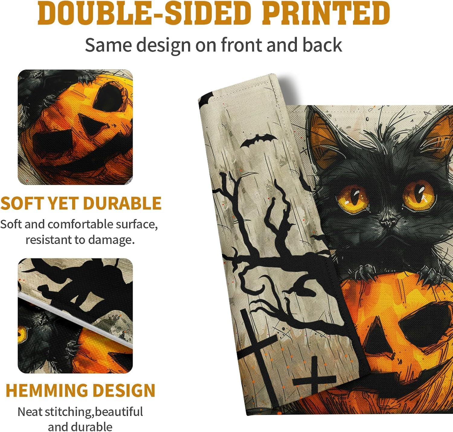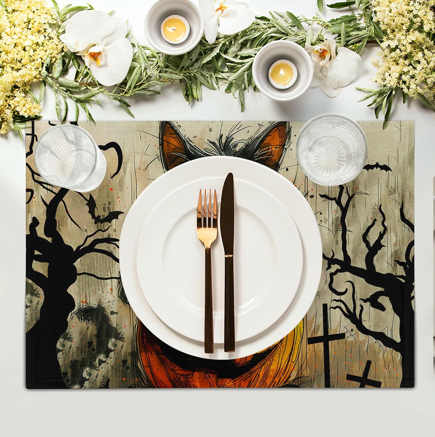 Halloween Black Cat Pumpkin 12x18 Placemats Set of 4 Happy Halloween Bat Branch Linen Table Place Mat Seasonal Fall Washable Heat Resistant Non Slip Table Placemats for Party Kitchen Dining Decor