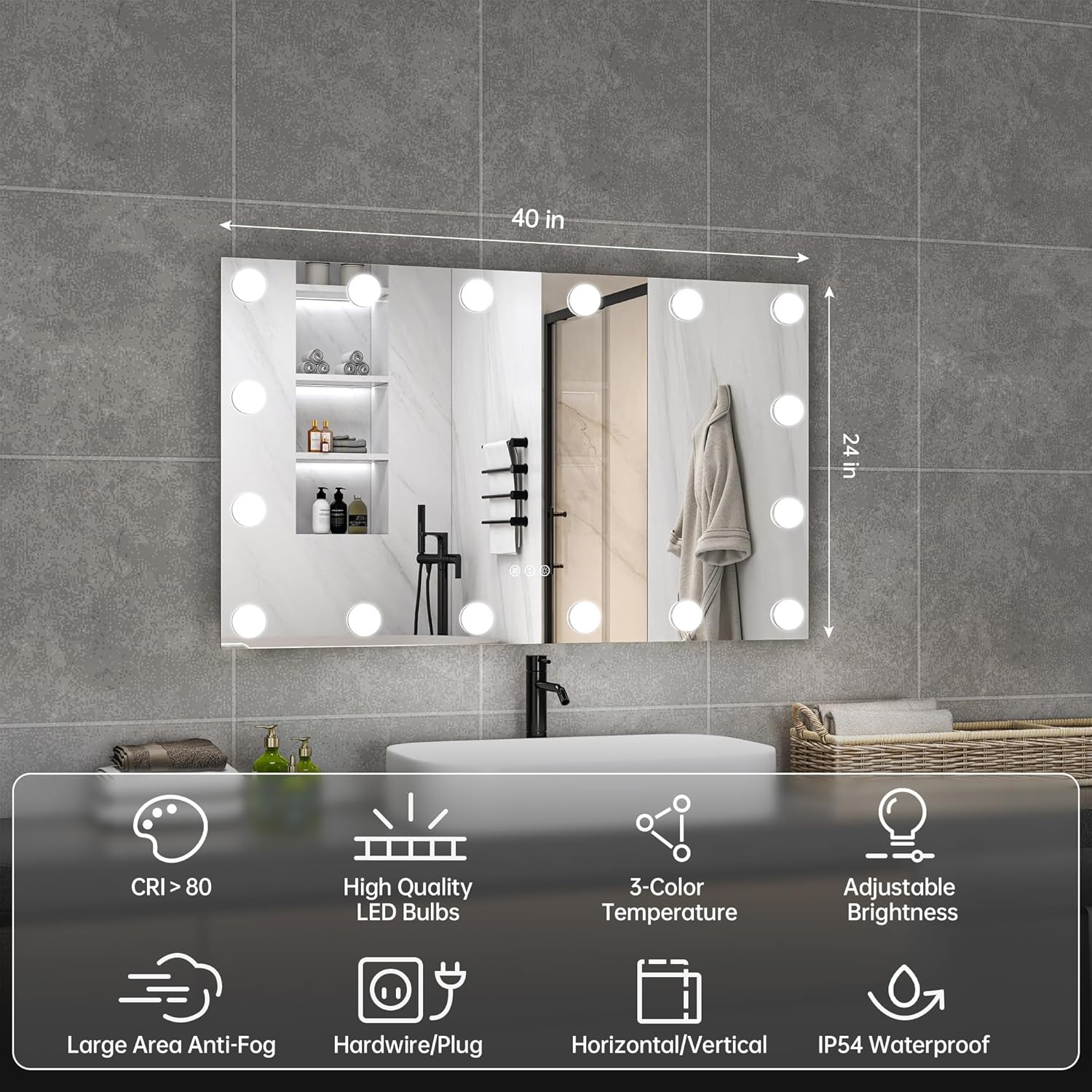 - 【Hollywood Design with Full Illumination】This modern bathroom mirror features a 40" x 24" HD glass mirror with a Hollywood-style design and 16 LED bulbs, delivering even, shadow-free lighting. Its frameless design and elegant Hollywood aesthetic bring style and functionality to any luxurious bathroom décor.