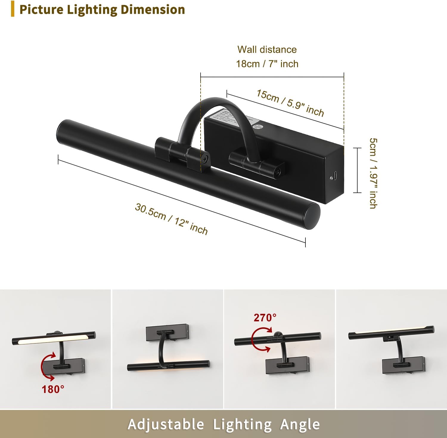 - Adjustable Light Direction: The lamp head can be 270Β° rotatable, combined with 180Β° spinning swing arm, the picture frame light disperses the light wherever you want, it's a perfect lighting solution for your artwork or family portrait wall.