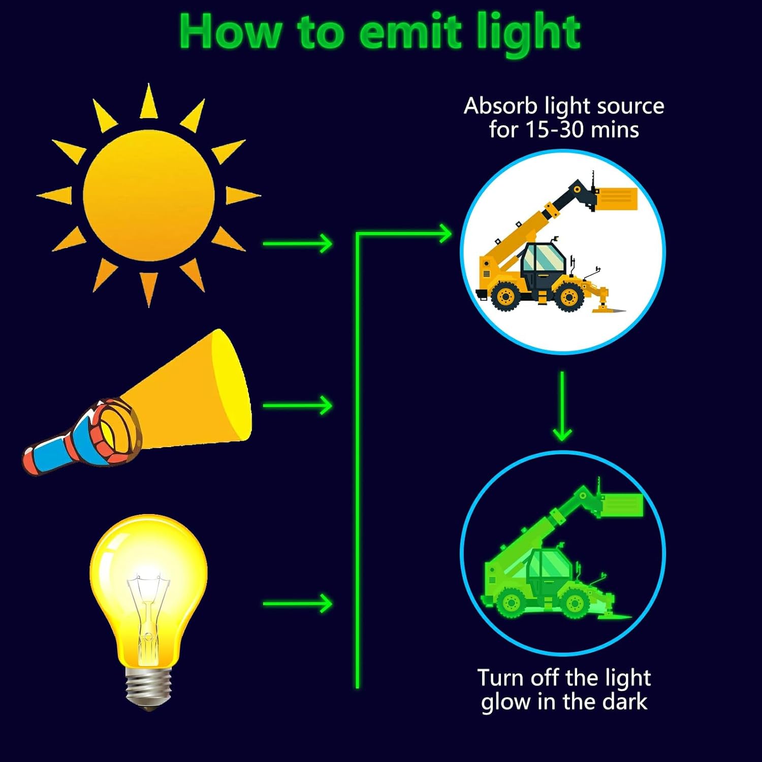 - β¦ Glow Construction Wall Decals: These glow wall decals for ceiling are made of quality luminous material,they will glow brightly when absorb enough light during the day. You just need to put it under lamplight flashlight ,room light or sunshine for 15 minutes, it will keep glowing for 8-10 hours with a gentle green fluorescent light. Please ensure the light shines on the decals without obstruction, the longer it takes to absorb light, then to light up for up to longer.
