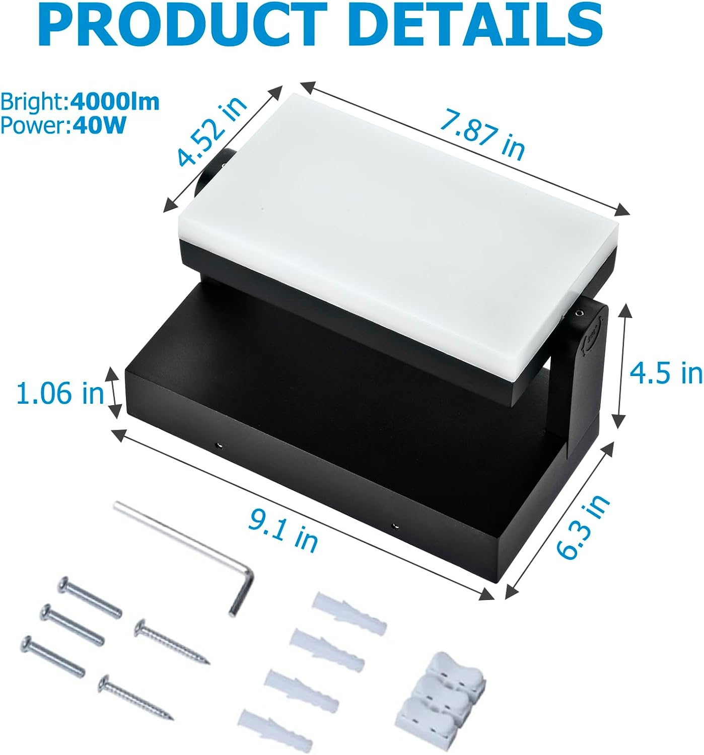- Super Bright & Anti-glare: wall pack light Bright up to 4000lm but not dazzling! the outdoor wall lighting provide excellent illumination for any space, Equipped with 105 high-end LED lamp beads .the 4000LM/40W outdoor security lights can cover a lighting area of 3500 sq.ft. This wall flood light is very modern and stylish, and can decorate your house in all directions.