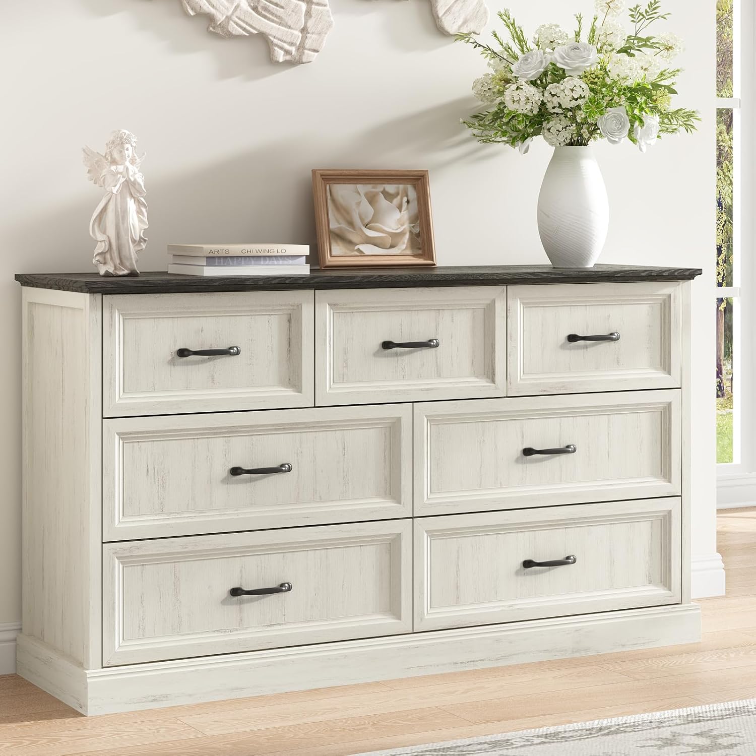- Versatile Usage: This white dresser offers various placement options for your room. Beyond being a storage cabinet in the bedroom, it serves as a entryway dresser to put daily items and overflow, or even as a TV stand(suit for 60" TV) in the living room for odds and ends. The classic farmhouse dressers are suitable for most spaces and styles of homes, can be integrated into different scenes, such as bedroom, living room, closets, hallway, and entryway etc. The farmhouse dresser with drawers can fit them perfectly.