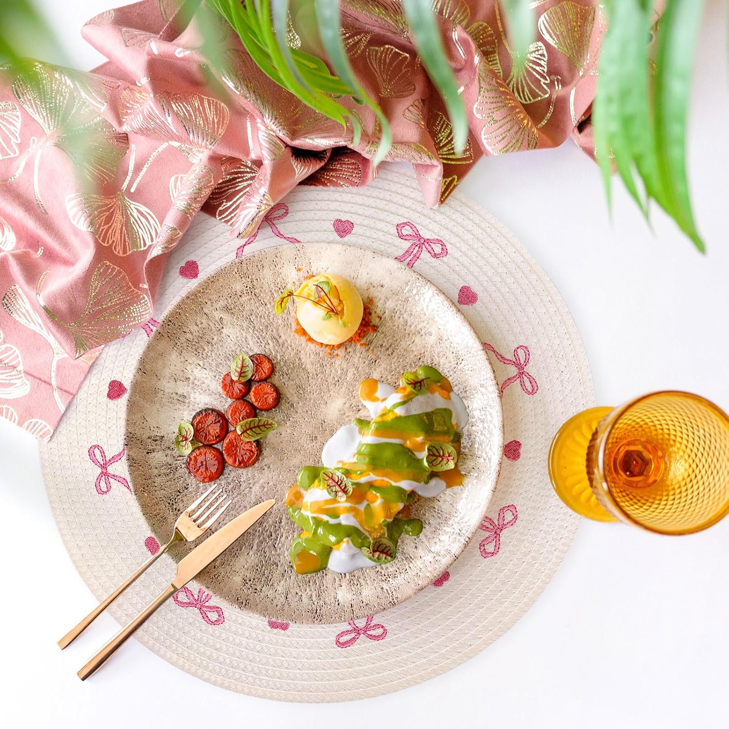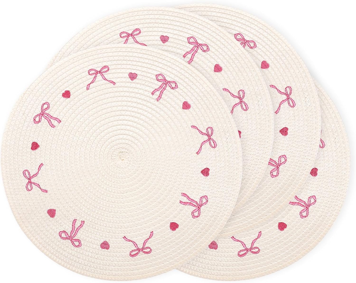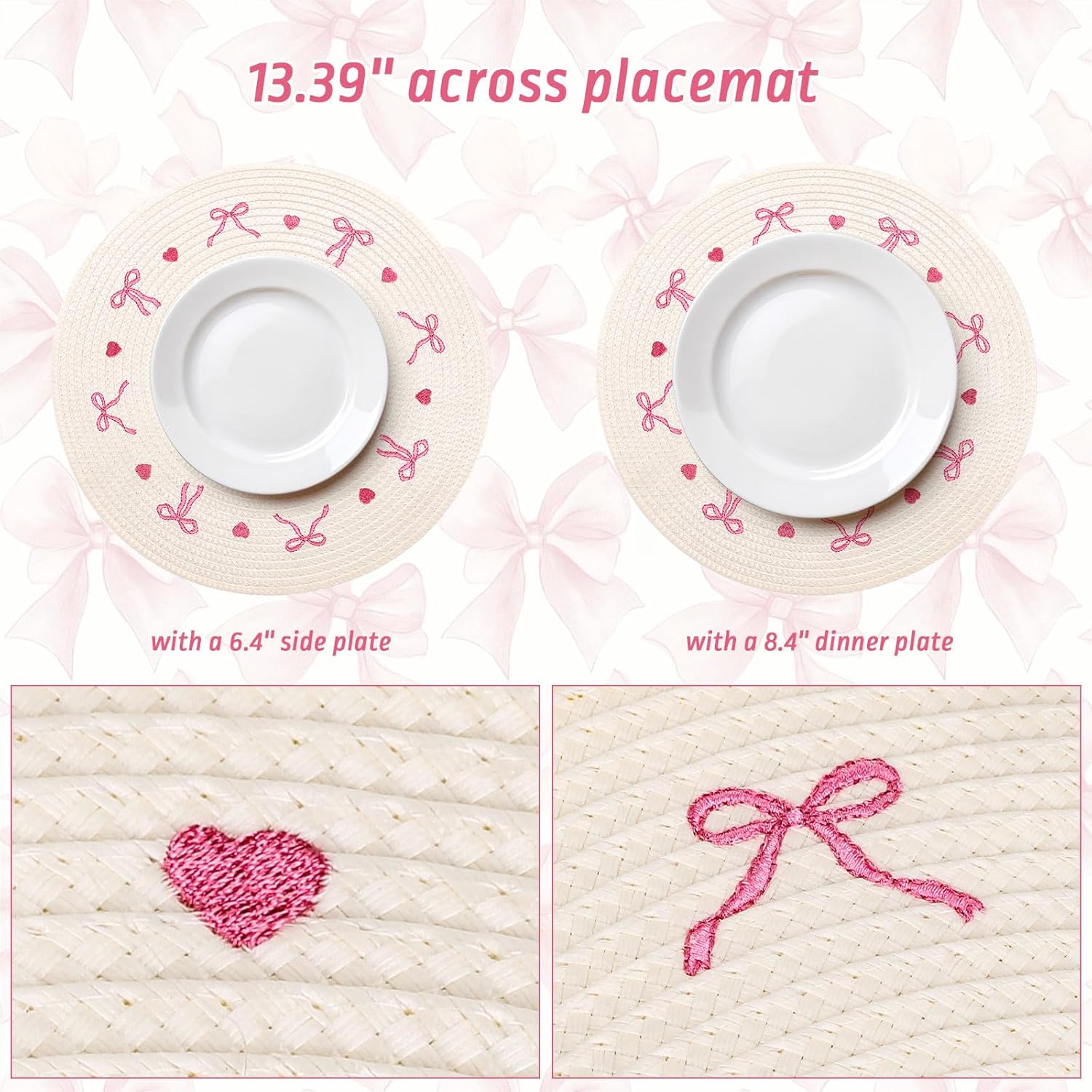 Whaline 4Pcs Round Placemats White Pink Bow Embroidered Place Mats Coquette Bowknot Heart Dinner Table Mats for Home Wedding Baby Shower Birthday Party Decor
