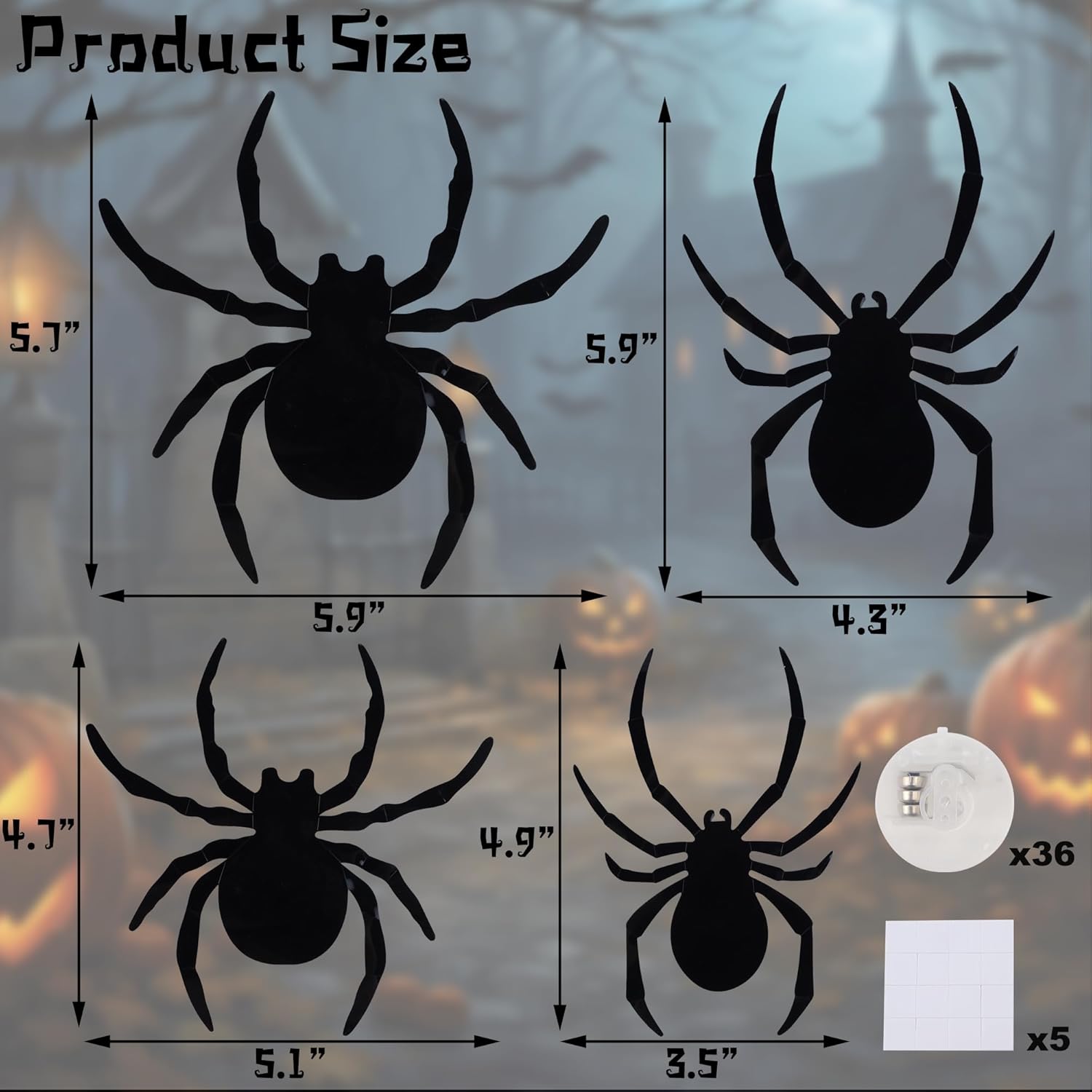 - Halloween LED Spider Set β Spookier than Ever: This Halloween spider decoration set includes 36 spiders Stickers, 36 LEDs( 24 purple flashing lights, 12 alternating red and blue lights), 80 pack adhesive tapes and an installation instruction. Unlike standard Halloween wall decor, these light-up spiders will make your Halloween home decor and haunted display even more eye-catching.