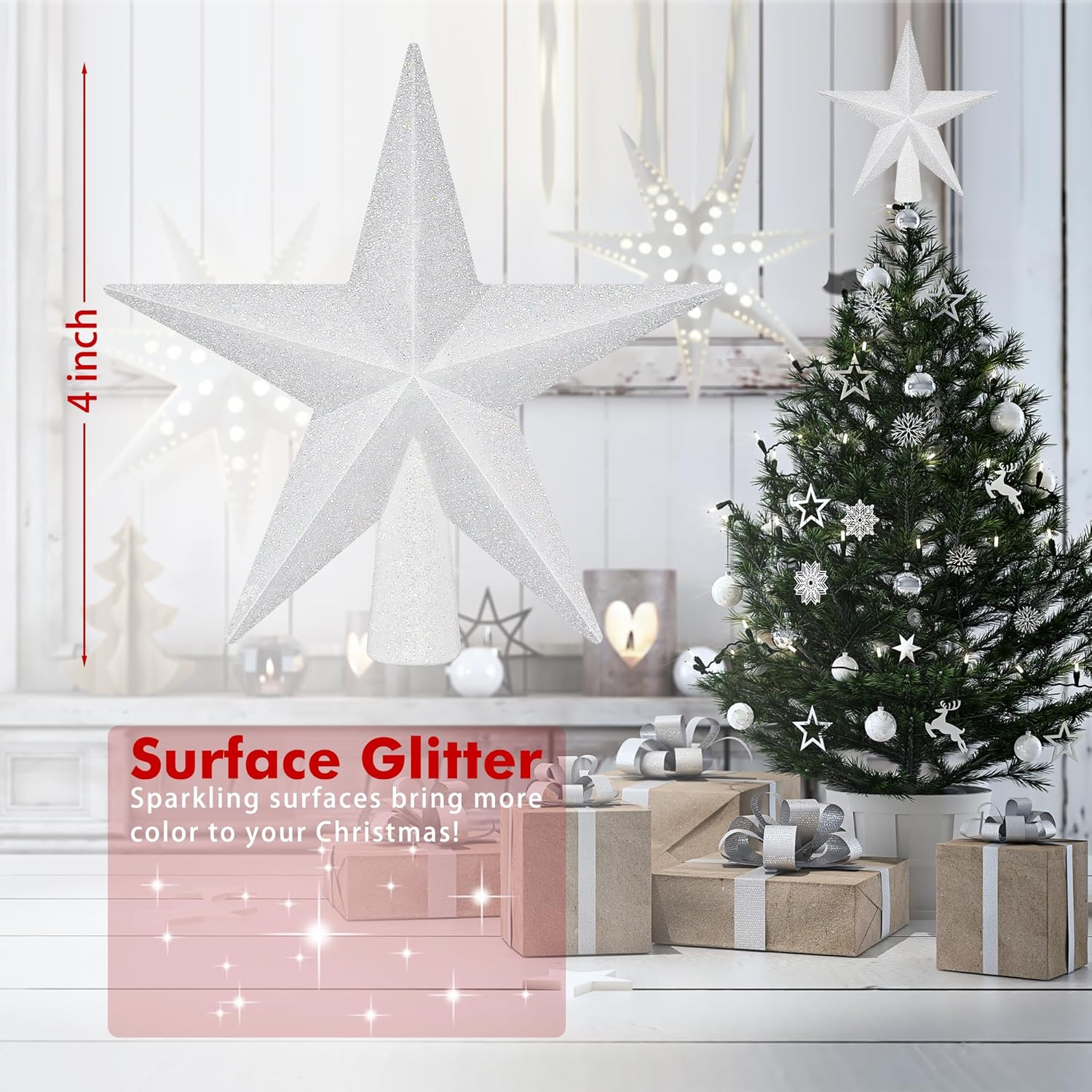 - Perfect Size for Small Trees – This 4-inch white tree topper star fits 3-4ft Christmas trees perfectly, adding a festive glow and holiday cheer to your cozy decor