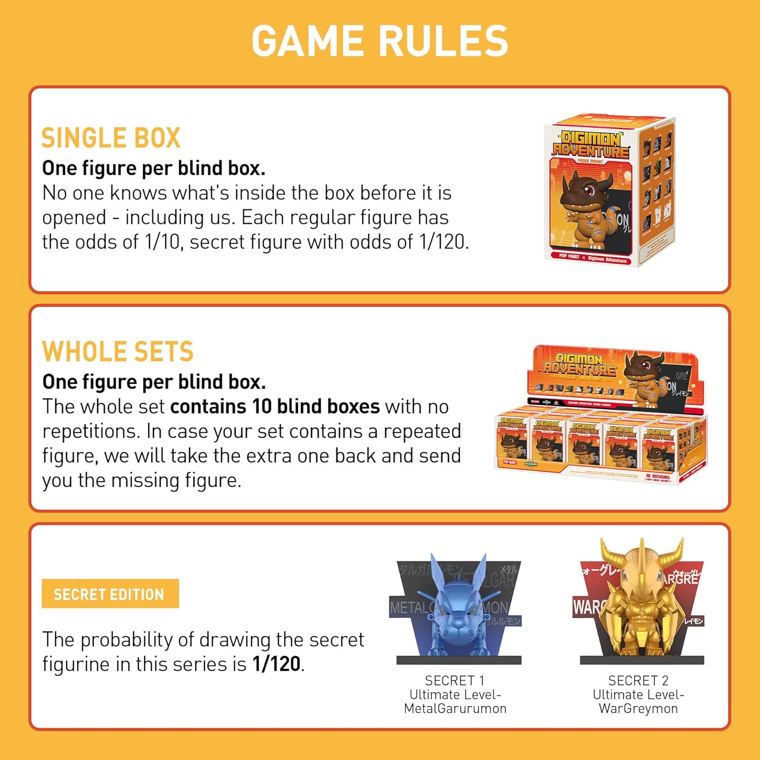 - POP MART Digimon Adventure Fridge Magnet Series Figures: The blind box contains a random figure from a specific series. Each blind box only contains one figure. No one, including us, knows what's inside. This collection contains 10 blind box figures, one of them might be the secret edition.