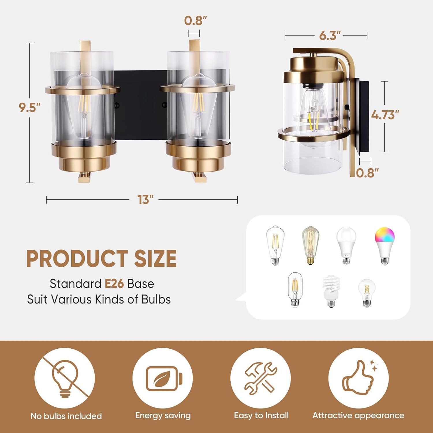 - ♥Product Feature: Hardwired.Black gold bathroom light fixture with clear glass shade;Modern Wall Sconce lighting is easy to install and can be mounted as either up light or downlight.