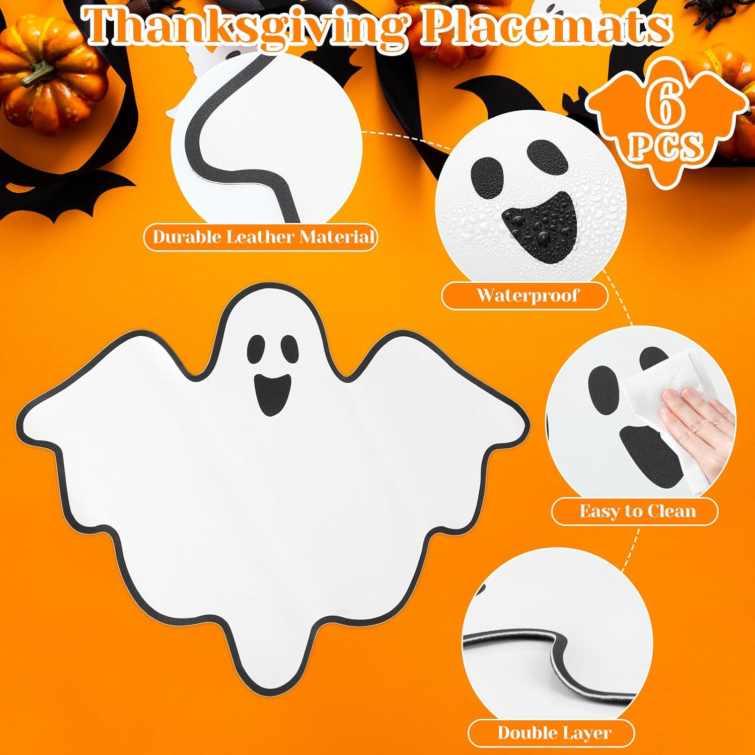 Remerry 6 Pcs Halloween Leather Table Placemats Washable Ghost Dinner Mats Easy to Clean Halloween Spooky Leather Placemats Ghost Table Mats for Holiday Kitchen Dining Party Decoration