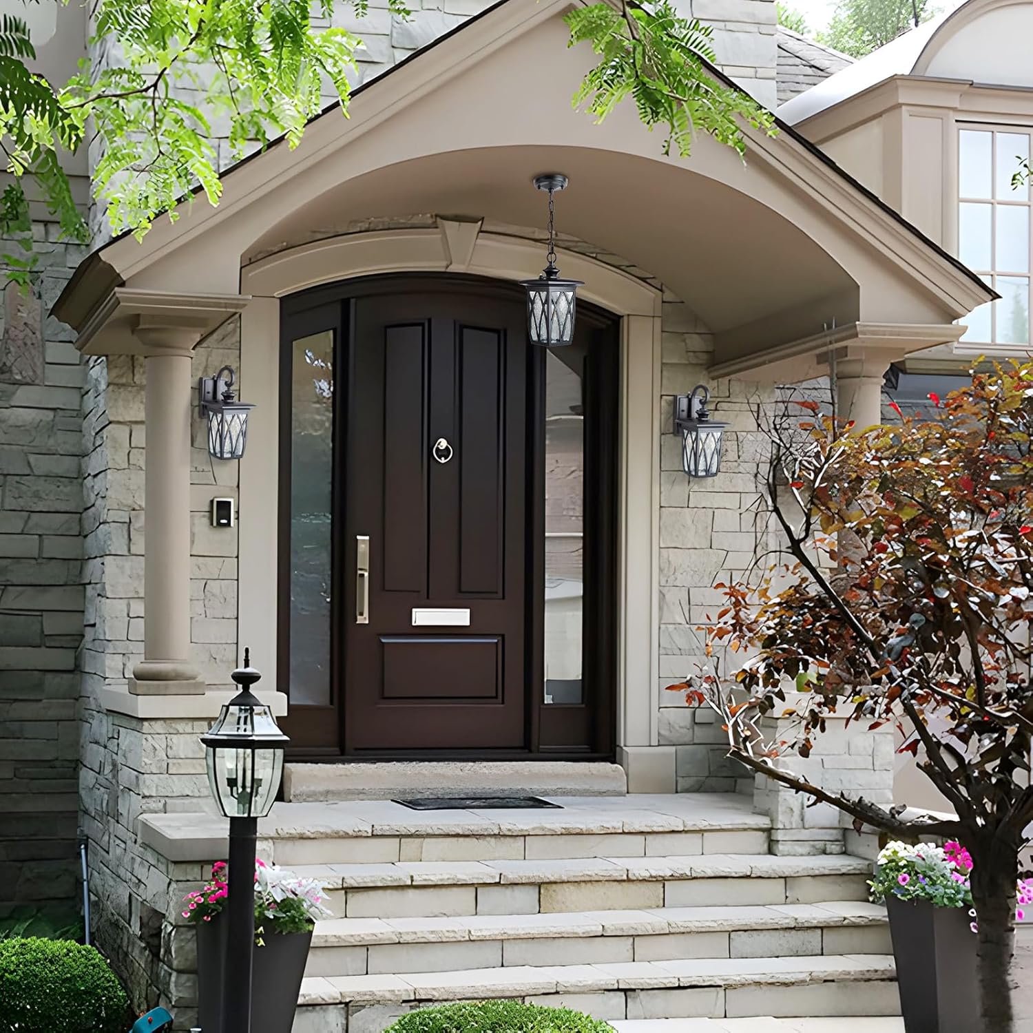 - Traditional Craftsman Style Wall Lantern – Make a statement with these outdoor wall sconce lights featuring elegant water ripple glass. The timeless Craftsman-style design enhances curb appeal and provides warm, inviting illumination to porches, garages, and entryways