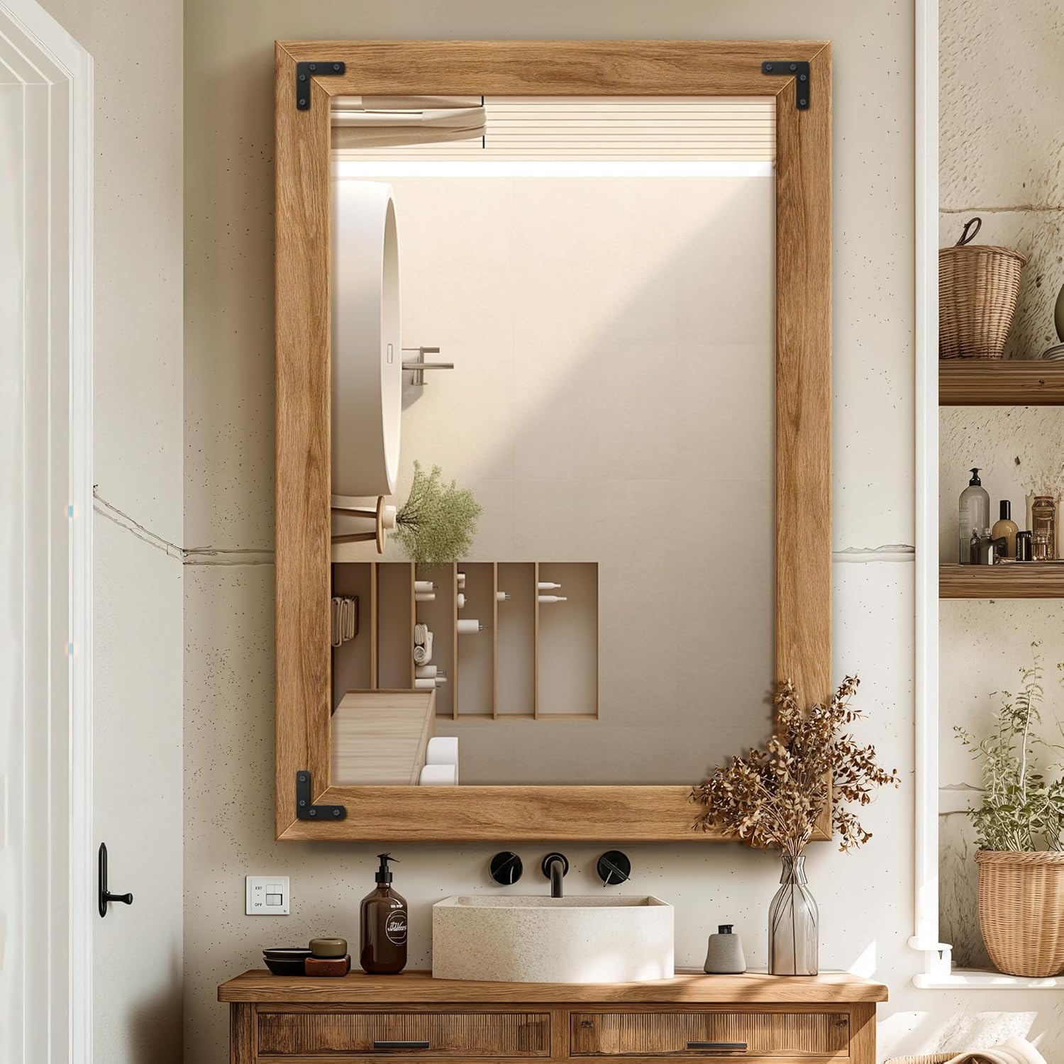 - Rustic Elegance for Your Home: This beautifully crafted rustic wood vanity mirror enhances your space. The distressed brown wooden frame exudes warmth and character, while the sleek black metal mount adds a modern farmhouse touch—perfect for bathrooms, bedrooms, entryways, or living rooms.