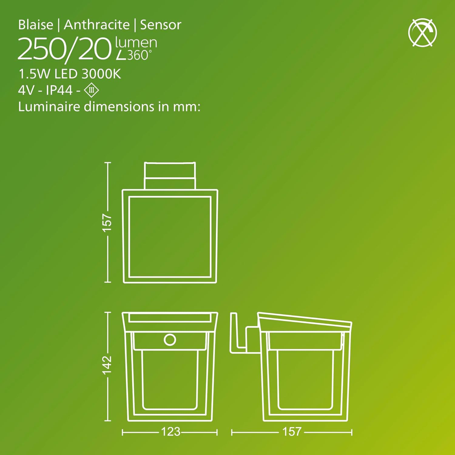 Philips Solar LED 1-Pack Ultra-Efficient Wall Lantern - Blaise, Dusk to Dawn, Automatically Linkable, Daylight and Motion Sensor, 3000K Bright White Light, IP44, Anthracite