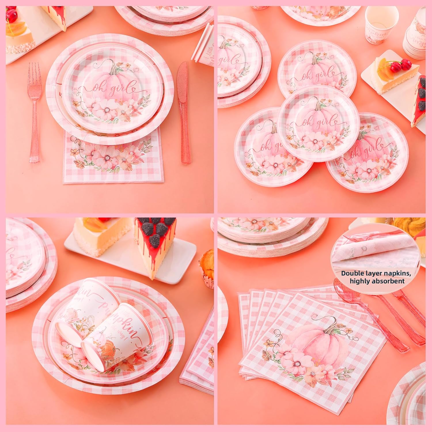 - 【Finest Quality】- Gudvilla little pumpkin plates have a protective film on top, making the board waterproof and oil resistant, pink baby shower plates are thickened to prevent bending, leaking or tearing, no need to stack two pink pumpkin paper plates. Pumpkin party plates have a raised edge to avoid food spills. The double layer design of the little pumpkin baby shower napkins has strong water absorption and will not fade.