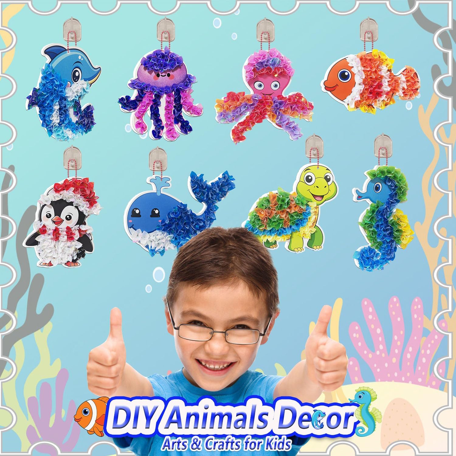 - **3. π Complete All-in-One Ocean Craft Kit Everything included for hours of creative play: β 8 adorable foam sea animals (Jellyfish, Seahorse, Octopus, Blue Whale, Dolphin, Penguin, Clownfish, Sea Turtle) β 800+ shiny fabric squares (assorted ocean colors) β 2 poke sticks + protective working pad β easy instructions (Perfect for beach trips, playdates, or quiet time!)