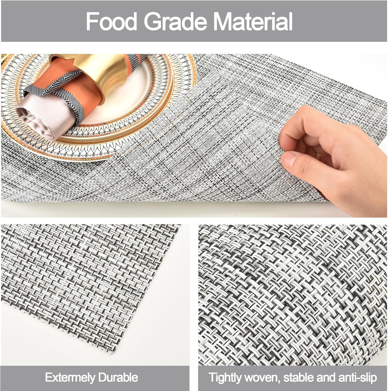 - Environmentally Material: 70% PVC and 30% Polyester. PVC materials are used for the placemats, very durable, flame-retardant, no fading and heat resistant, very safe to use, all placemats are cut by machine with no rough selvedge, free bending, free cutting. Placemats for dining table set of 6, they are the best decoration and protection for your dining table