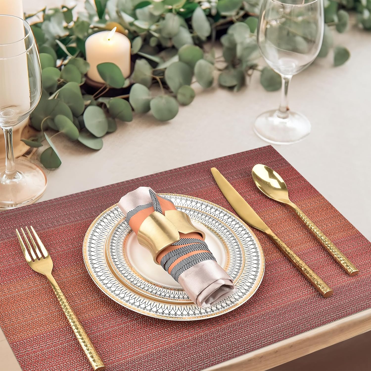 - Environmentally Material: 70% PVC and 30% Polyester. PVC materials are used for the placemats, very durable, flame-retardant, no fading and heat resistant, very safe to use, all placemats are cut by machine with no rough selvedge, free bending, free cutting. Placemats for dining table set of 4, they are the best decoration and protection for your dining table