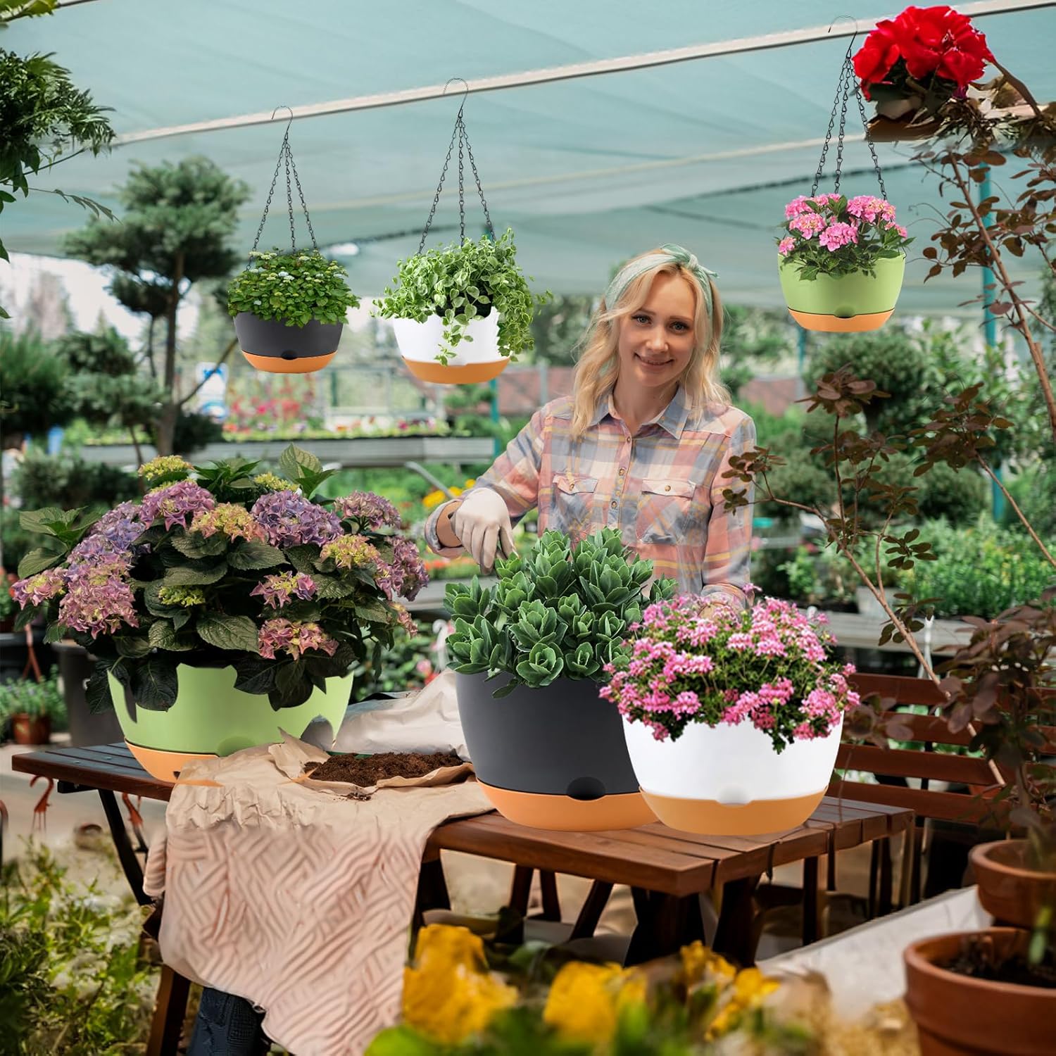 - 【Ventilation and Drainage】The bottom of the planter has a porous design for proper ventilation and drainage. for effective drainage and ventilation. This, combined with the mesh-like structure at the base of the 8/10/12inch self-watering hanging pots, ensures optimal aeration. Suitable for plastic hanging baskets for plants, this design promotes well plant respiration.