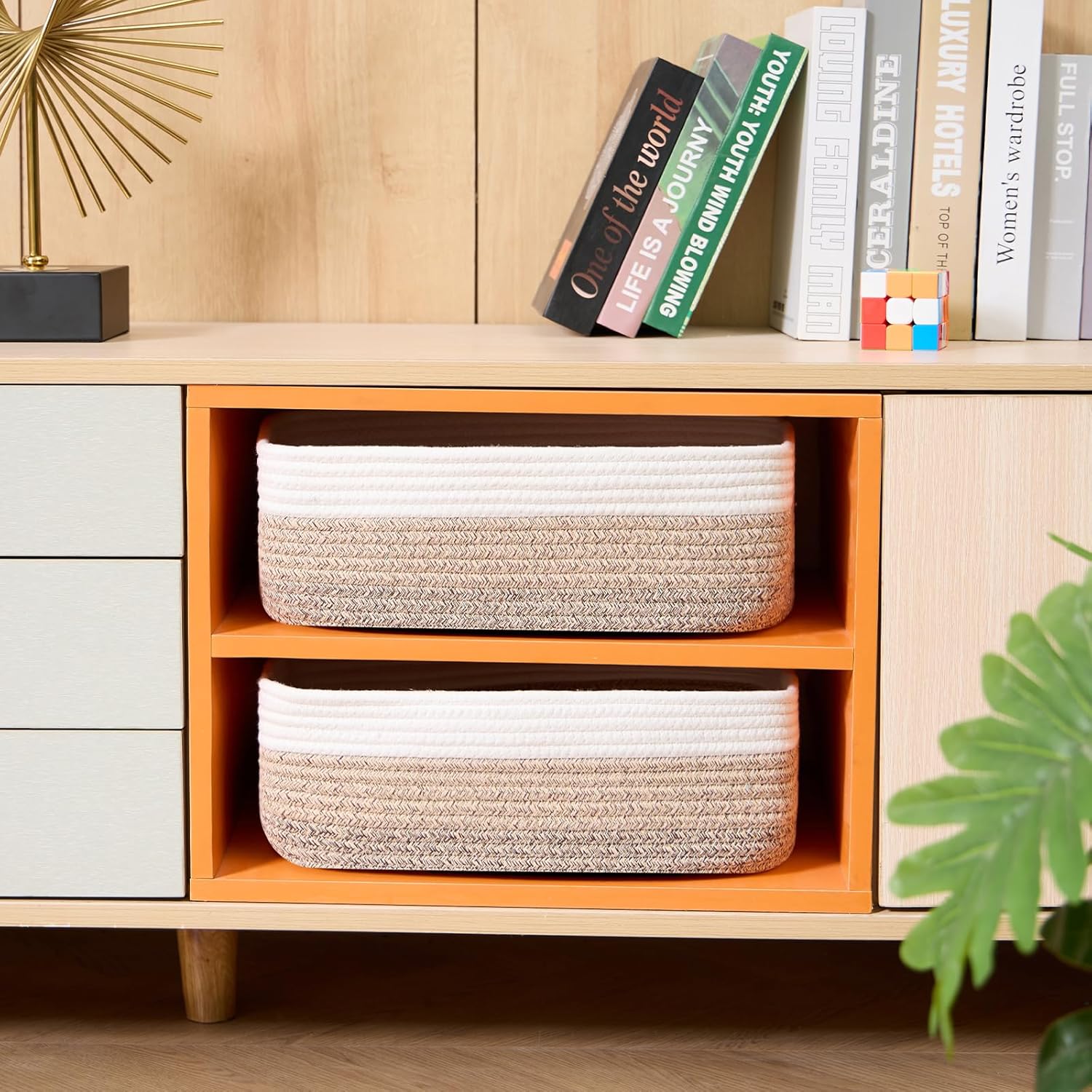 Large Shallow Organizing Baskets 15x11x5.1 Inches - Rope Woven Storage Bins for Bathroom, Shelves, Cube Closet, Gradient Brown 2 Packs