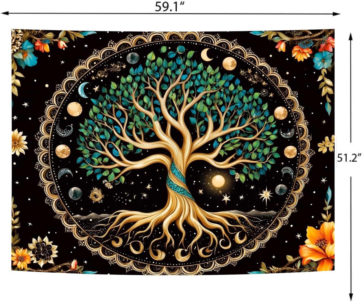 Delur Tree of Life Tapestry Moon Phase Nature Flower Plant Tapestry Wall Hanging Boho Mandala Spiritual Sun Aesthetic Psychedelic Headboard for Bedroom Living Room Home Decor (51.2" x 59.1")