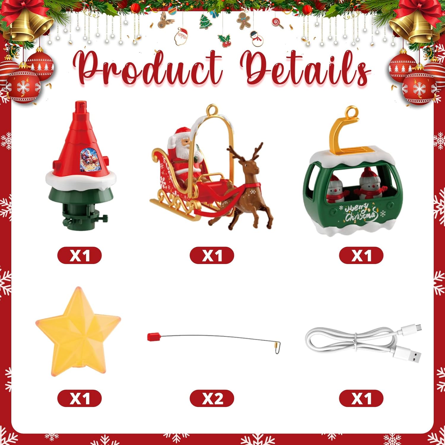 - COMPLETE KIT: Includes main rotating body, star topper, sleigh with reindeer, cable car, mounting hardware, and USB cable for power - everything needed for setup