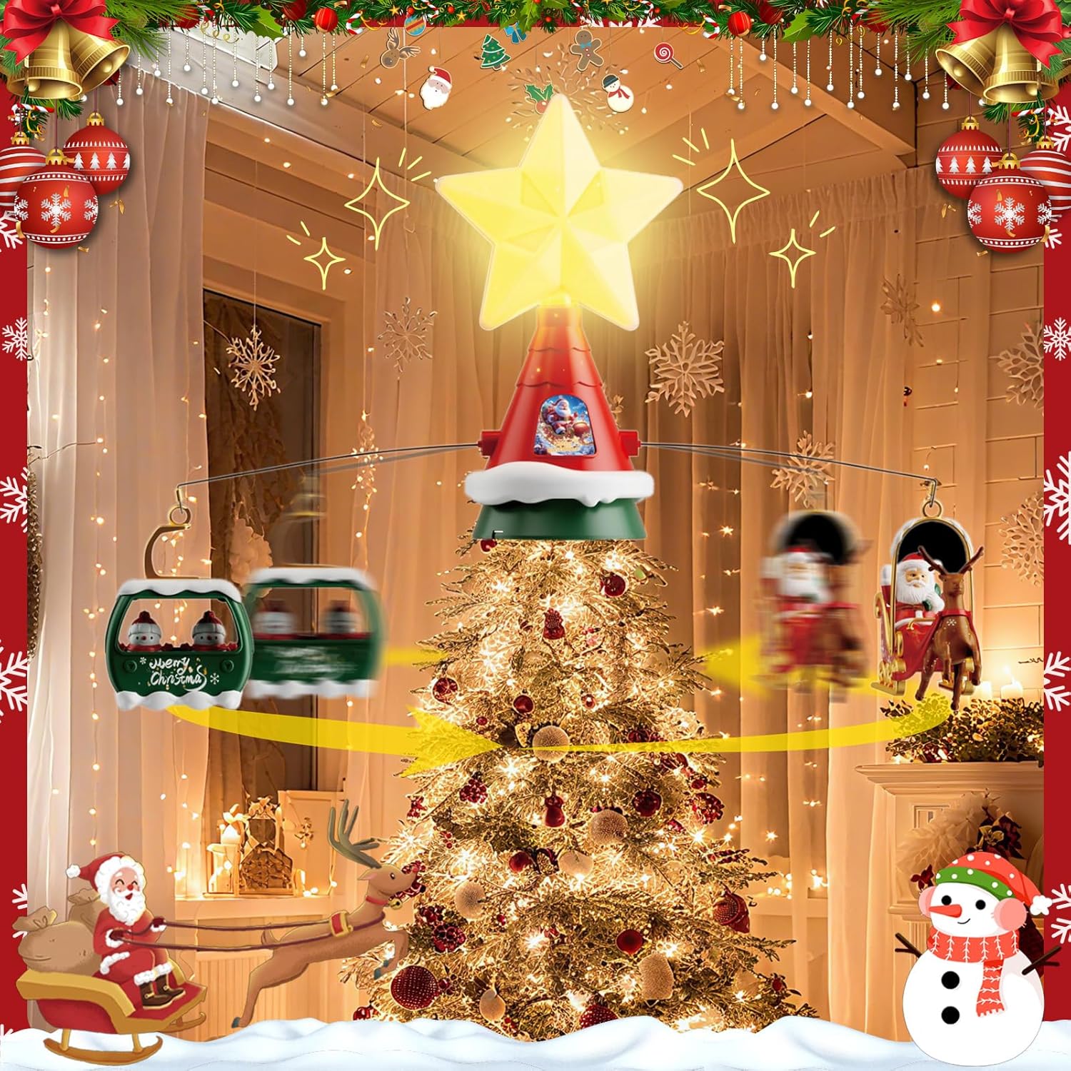 - FESTIVE DESIGN: Rotating Christmas tree topper featuring illuminated LED star, Santa's sleigh with reindeer, and cable car decorations for a magical holiday display
