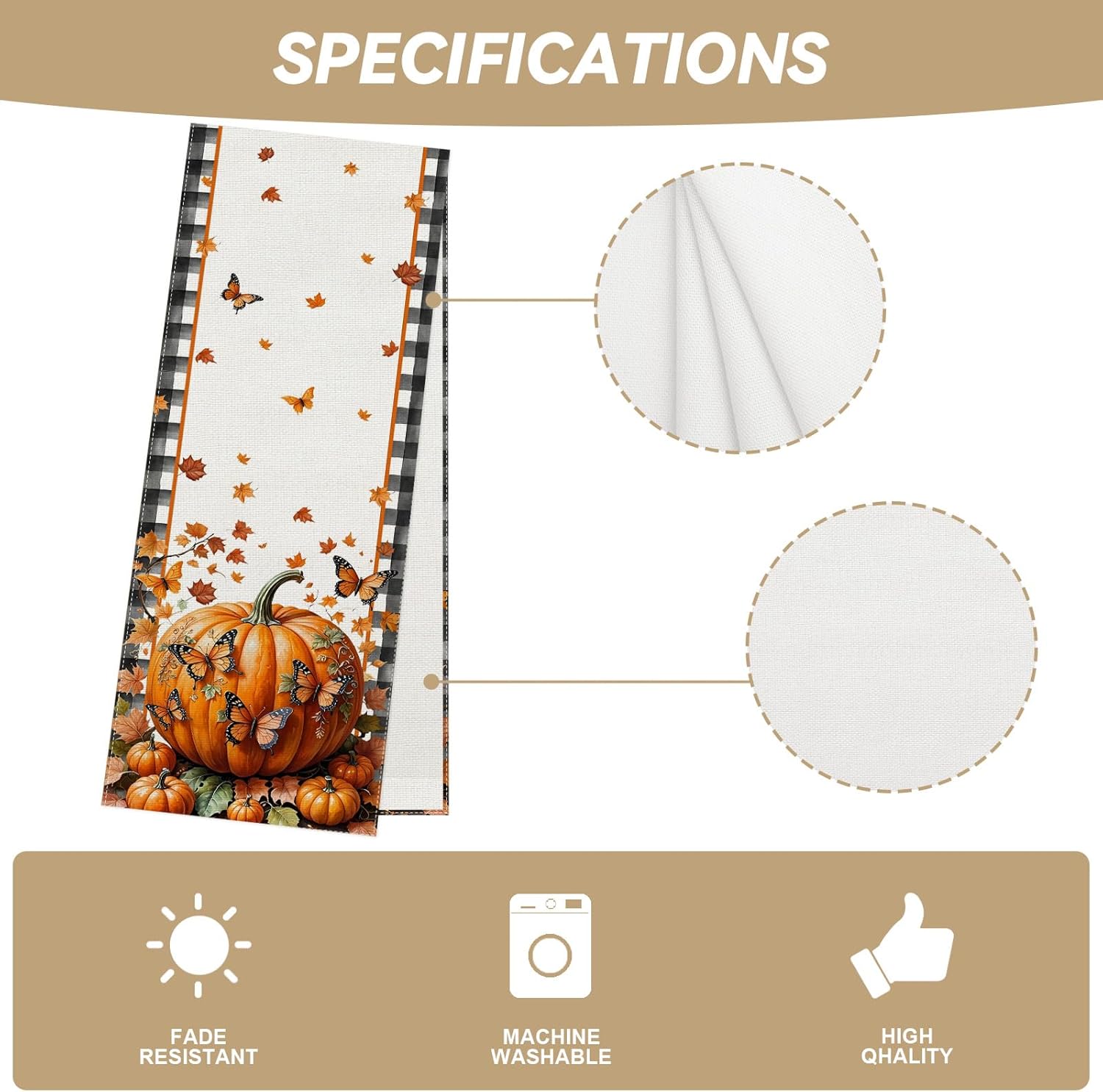Linen Black and White Buffalo Check Plaid Fall Table Runner 108 Inches Long, Fall Leaves Pumpkin Butterfly Home Kitchen Table Decor, Farmhouse Autumn Thanksgiving Harvest Festival Decorations for Home